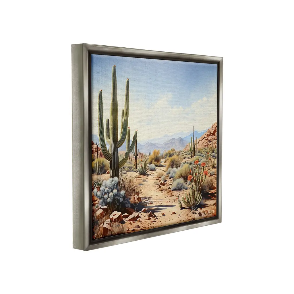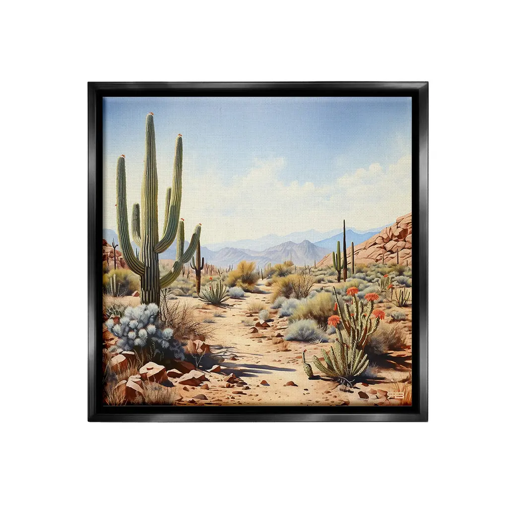 Elevate your home or office to the next level with Stupell Framed Floating Canvas Wall Art. Our premium hand-stretched canvas is mounted securely into a sturdy lightweight frame. The museum-style gap between the wrapped canvas and the box frame gives the illusion of floating artwork. Stupell Wall Art is made in the USA.Features: Dimensions: 18 x 1.7 x 18 Frame, 17 x 1.5 x 17 Canvas ArtFloating Frame Canvas Products are available in sizes 18"x18" and 25"x25". All Floating Frame Canvas Products have a 1.7" Depth.Wall Art is Ready to Hang with Hardware Free Hanging. No Installation required. For Easy Set Up Lean or Layer Artwork on Shelf or Against Wall. Artwork is Permently Fixed into the Frame.Our elevated 1.7" Thick Floating Frame is the perfect complement to our canvas style Wall Art. We use only the highest quality inks in house with industry leading printing solutions. Canvas is hand stretched over a durable wood foundation and then mounted securly into a Modern Box Frame. Made in the USA.Artwork Relates To: Road, Nature, Sky, Scenery, Landscape, Desert, Cactus, Mountain, Vegetation, Botanical, PlantDesign by RB