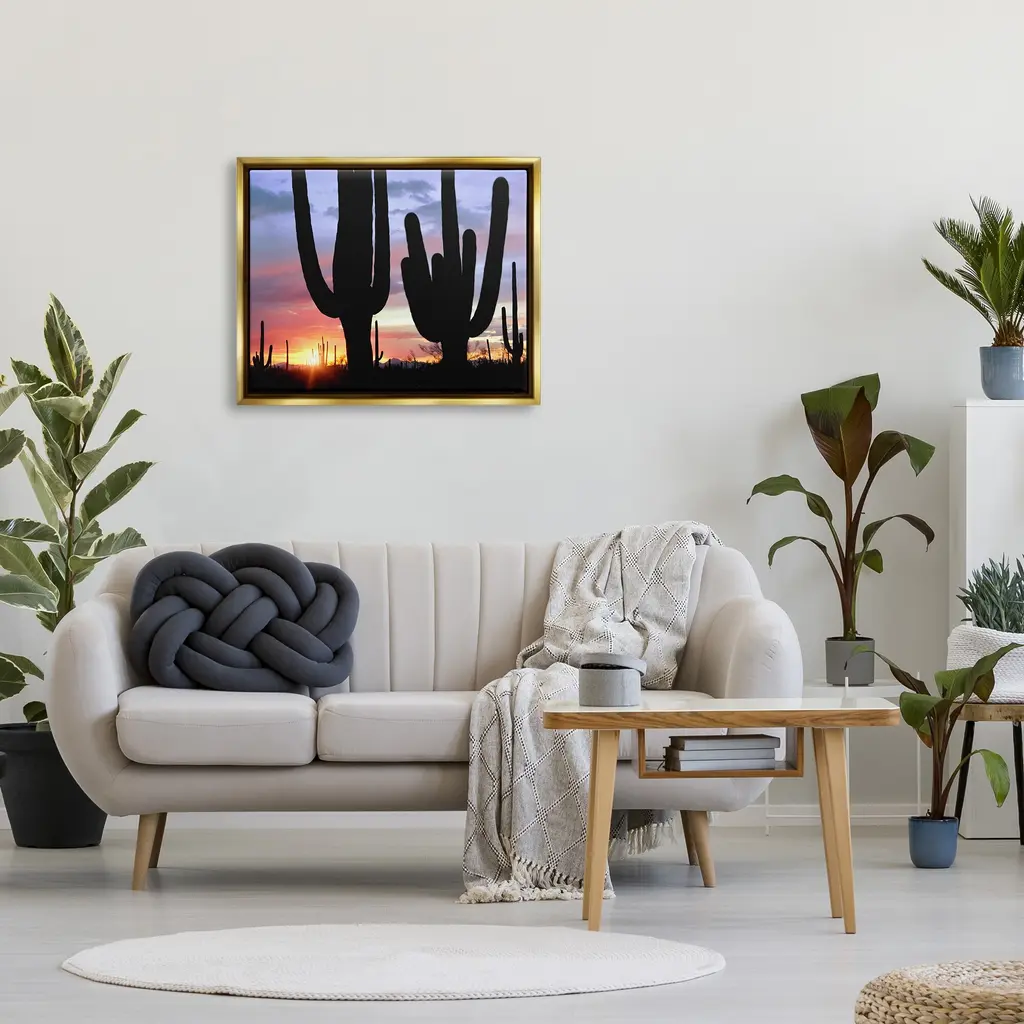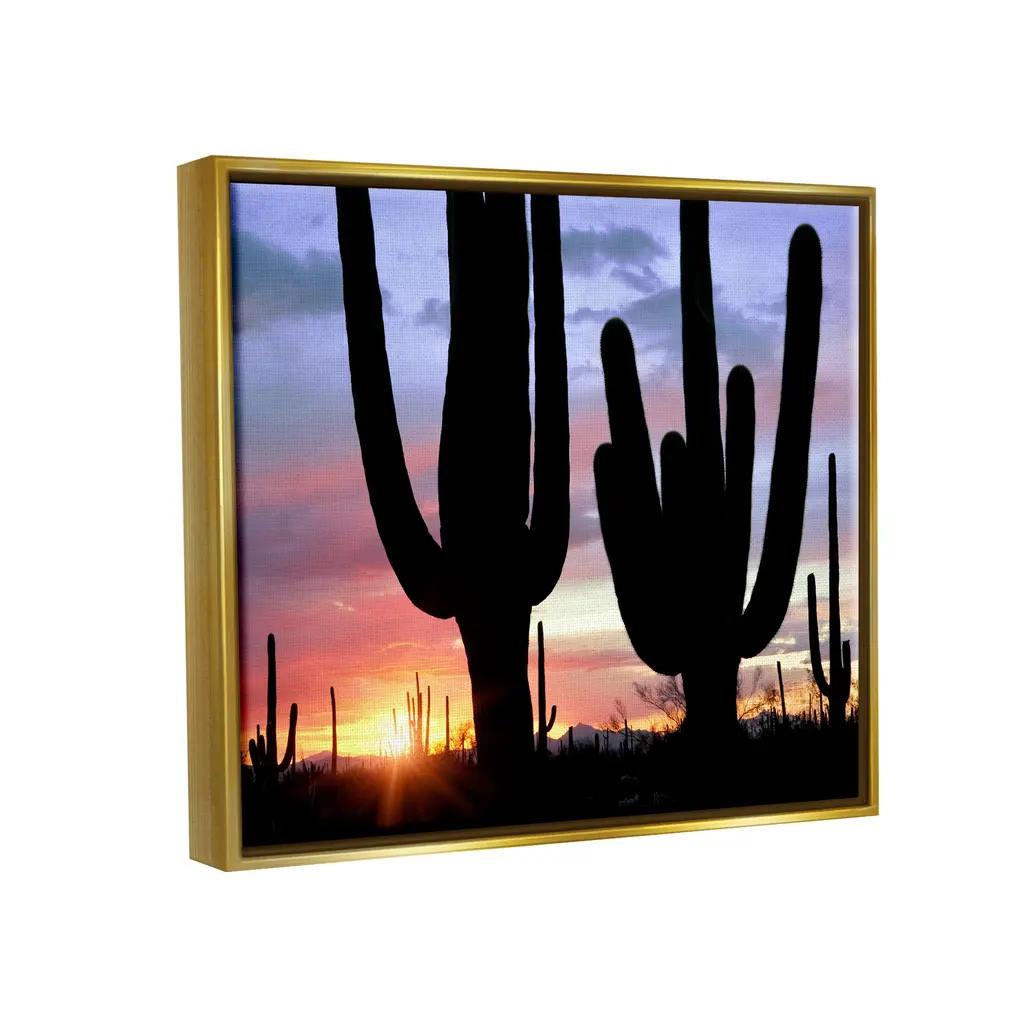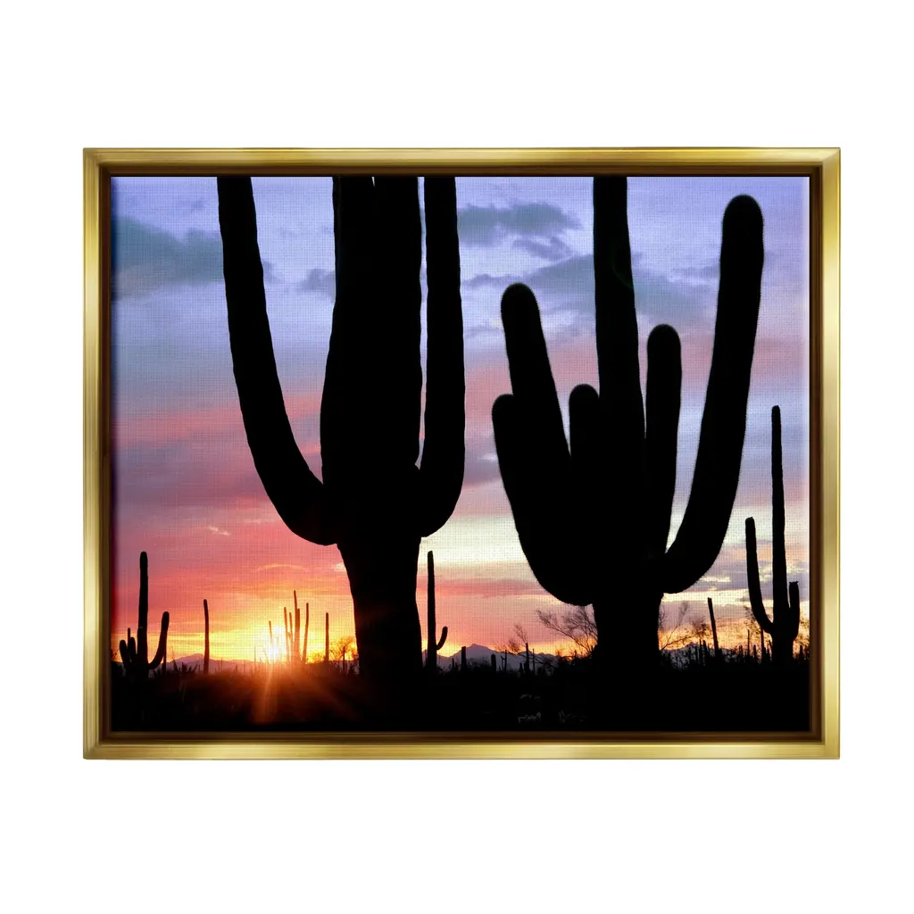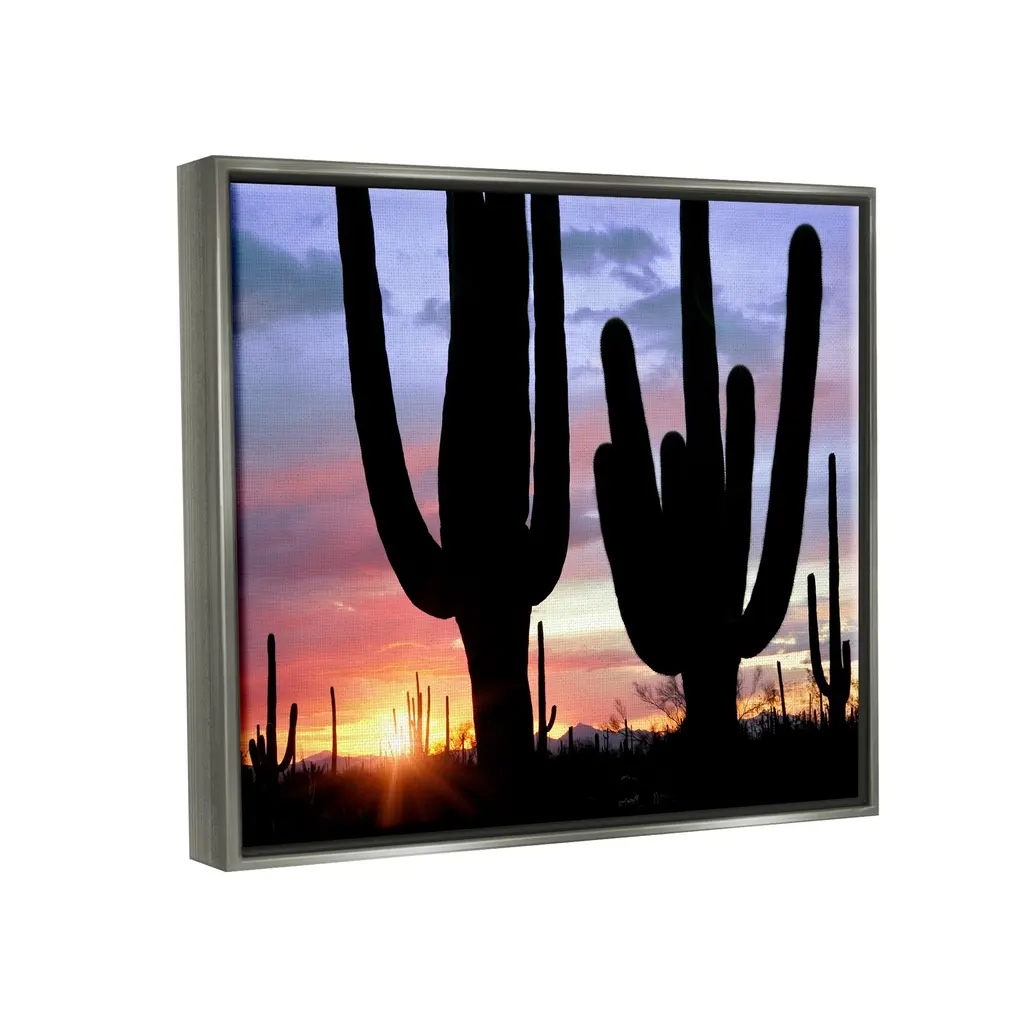 Elevate your home or office to the next level with Stupell Framed Floating Canvas Wall Art. Our premium hand-stretched canvas is mounted securely into a sturdy lightweight frame. The museum-style gap between the wrapped canvas and the box frame gives the illusion of floating artwork. Stupell Wall Art is made in the USA.Features: Dimensions: 21 x 1.7 x 17 Frame, 20 x 1.5 x 16 Canvas ArtFloating Frame Sizes Include Standard: 21 x 1.7 x 17 Oversized: 31 x 1.7 x 25Wall Art is Ready to Hang - No Installation or Hardware Needed. For Easy Set Up Lean or Layer Artwork on Shelf or Against Wall.Our elevated 1.7" Thick Floating Frame is the perfect complement to our canvas style Wall Art. We use only the highest quality inks in house with industry leading printing solutions. Canvas is hand stretched over a durable wood foundation and then mounted securly into a Modern Box Frame. Made in the USA.Artwork Relates To: Nature, Scenery, Landscape, Sky, Cactus, Plant, Sunlight, Sunrise, SunsetDesign by Dennis Frates