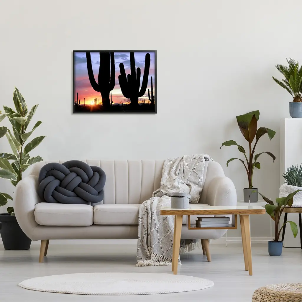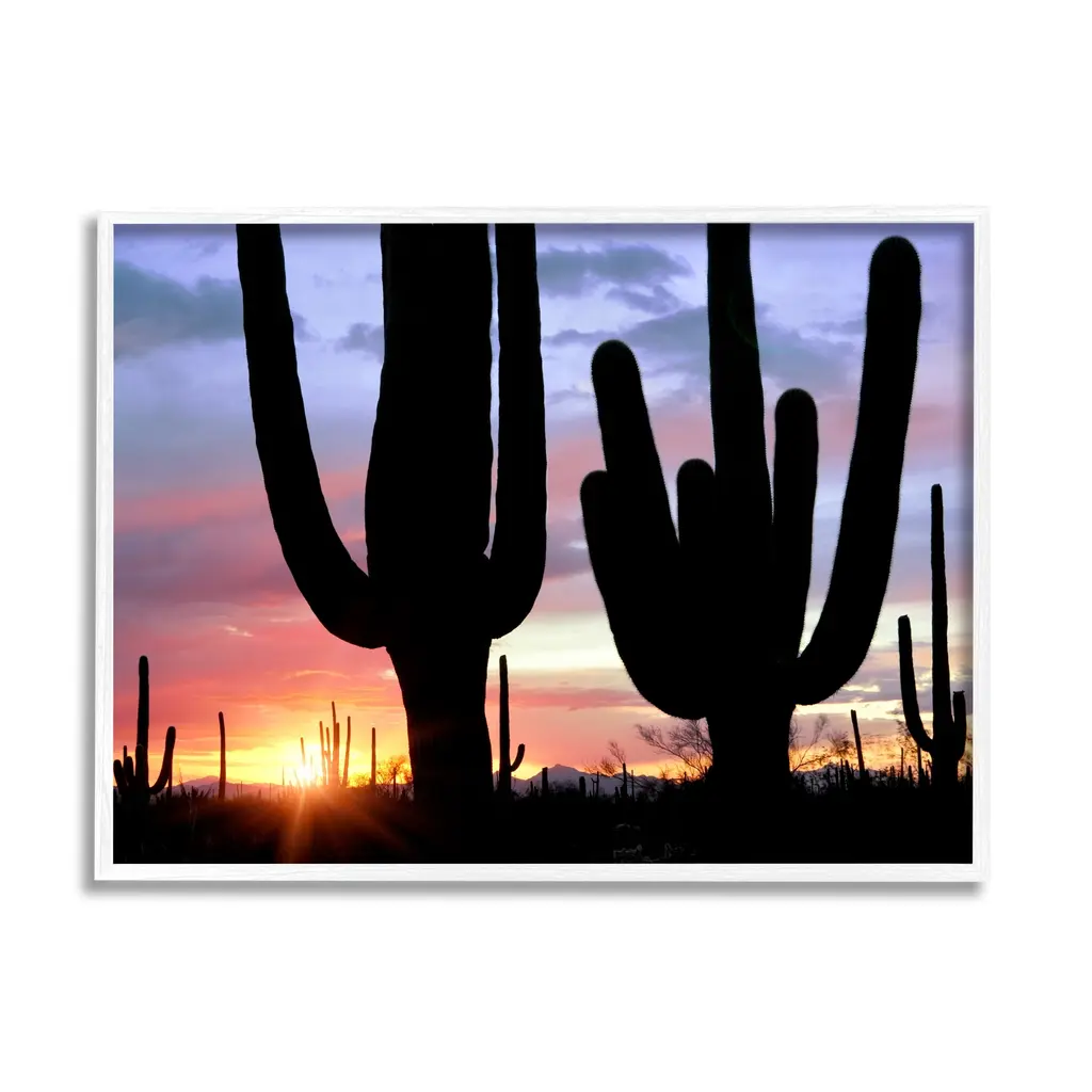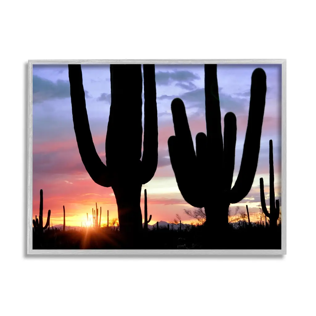Add dimension to any room with our textured Framed Giclee Artwork. Our framed artwork is securely mounted into a 1.5-inch thick wood grain frame and ready to hang. Frames are available in three alluring styles: black, gray farmhouse and white. In addition, you should check out our oversized options if you want a statement piece. Stupell Wall Art is made in the USA.Features: Dimensions: 14 x 1.5 x 11 FramedFramed Giclee Sizes Include Standard: 14 x 1.5 x 11 Large: 20 x 1.5 x 16 Oversized: 30 x 1.5 x 24Wall Art is Ready to Hang - No Installation or Hardware Needed. For Easy Set Up Lean or Layer Artwork on Shelf or Against Wall.Our giclée prints are carefully mounted on a durable MDF backing, and then perfectly finished in a 1.5 inch thick woodgrain frame. Mounted frame colors include black, gray farmhouse and white. Made In USA.Artwork Relates To: Nature, Scenery, Landscape, Sky, Cactus, Plant, Sunlight, Sunrise, SunsetDesign by Dennis Frates