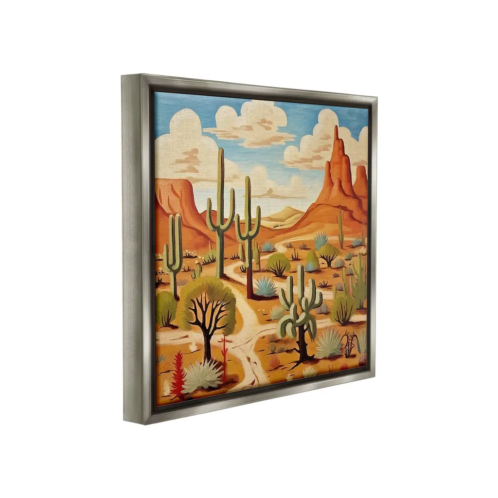 Elevate your home or office to the next level with Stupell Framed Floating Canvas Wall Art. Our premium hand-stretched canvas is mounted securely into a sturdy lightweight frame. The museum-style gap between the wrapped canvas and the box frame gives the illusion of floating artwork. Stupell Wall Art is made in the USA.Features: Dimensions: 18 x 1.7 x 18 Frame, 17 x 1.5 x 17 Canvas ArtFloating Frame Canvas Products are available in sizes 18"x18" and 25"x25". All Floating Frame Canvas Products have a 1.7" Depth.Wall Art is Ready to Hang with Hardware Free Hanging. No Installation required. For Easy Set Up Lean or Layer Artwork on Shelf or Against Wall. Artwork is Permently Fixed into the Frame.Our elevated 1.7" Thick Floating Frame is the perfect complement to our canvas style Wall Art. We use only the highest quality inks in house with industry leading printing solutions. Canvas is hand stretched over a durable wood foundation and then mounted securly into a Modern Box Frame. Made in the USA.Artwork Relates To: Desert, Nature, Cactus, Canyon, Mesa, Path, Cloud, Modern, SouthwesternDesign by Lazar Studio
