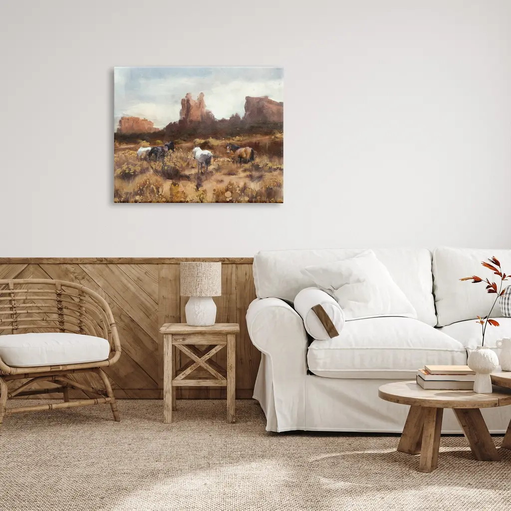 We create our stretched canvas to the highest standards. Using only the highest quality inks and canvas on Mimaki printers, we hand-cut and stretch each piece over a 1.5-inch thick wooden frame for hanging. As a result, the art comes ready to hang on the sturdy ledge with no installation required. Stupell Wall Art is made in the USA.Features: Dimensions: 20 x 1.5 x 16 InchesStretched Canvas Sizes Include Standard: 20 x 1.5 x 16 Large: 30 x 1.5 x 20 X-Large: 40 x 1.5 x 30 Oversized: 48 x 1.5 x 36Wall Art is Ready to Hang with Hardware Free Hanging. No installation required. For Easy Set Up Lean or Layer Artwork on Shelf or Against Wall.Our stretched canvas is created with the highest standards. We use only the highest quality inks and canvas on our in house Mimaki printers, and then hand cut and stretch each piece over a 1.5 inch thick wooden frame for hanging. Made In USA.Artwork Relates To: Painting, Nature, Animal, Horse, Mammal, Field, Grassland, Countryside, LandscapeDesign by Nina Blue