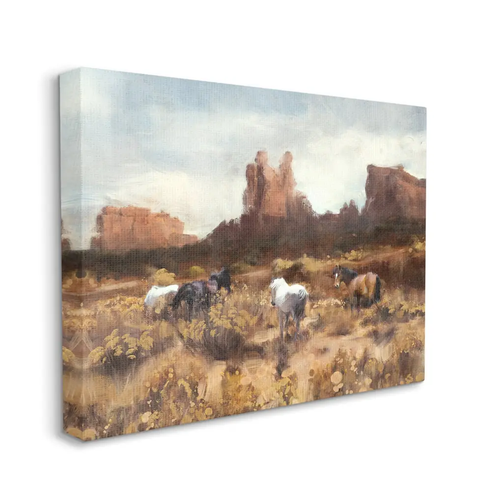 We create our stretched canvas to the highest standards. Using only the highest quality inks and canvas on Mimaki printers, we hand-cut and stretch each piece over a 1.5-inch thick wooden frame for hanging. As a result, the art comes ready to hang on the sturdy ledge with no installation required. Stupell Wall Art is made in the USA.Features: Dimensions: 20 x 1.5 x 16 InchesStretched Canvas Sizes Include Standard: 20 x 1.5 x 16 Large: 30 x 1.5 x 20 X-Large: 40 x 1.5 x 30 Oversized: 48 x 1.5 x 36Wall Art is Ready to Hang with Hardware Free Hanging. No installation required. For Easy Set Up Lean or Layer Artwork on Shelf or Against Wall.Our stretched canvas is created with the highest standards. We use only the highest quality inks and canvas on our in house Mimaki printers, and then hand cut and stretch each piece over a 1.5 inch thick wooden frame for hanging. Made In USA.Artwork Relates To: Painting, Nature, Animal, Horse, Mammal, Field, Grassland, Countryside, LandscapeDesign by Nina Blue