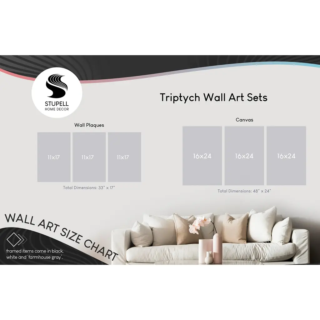 Proudly made in the USA! Our canvas triptychs are our newest and most distinguished offering yet! Each panel is mounted on sturdy 1.5 inch frame. Our vivid canvas is hand cut, then stretched and comes ready to hang. At this size, and with multiple pieces, it is sure to be a focal point of the room.Features:Wall Art is Ready to Hang - No Installation or Hardware Needed. For Easy Set Up Lean or Layer Artwork on Shelf or Against Wall.Our stretched canvas is created with the highest standards. We use only the highest quality inks and canvas on our in house Mimaki printers, and then hand cut and stretch each piece over a 1.5 inch thick wooden frame for hanging. Made In USA.Artwork Ideal for any Living Room, Den, Entryway, Bedroom, Office, Kitchen or Bathroom.Design by Annie Warren