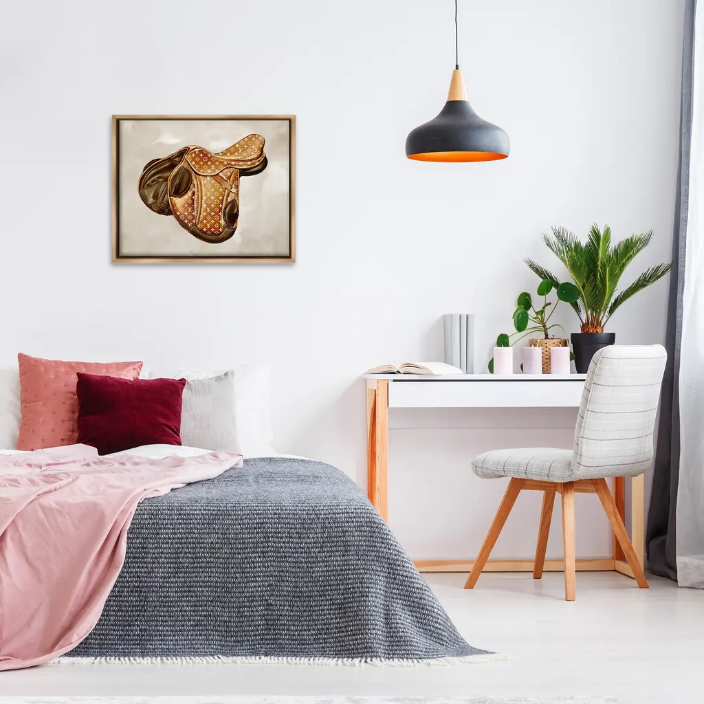 Elevate your home or office to the next level with Stupell Framed Floating Canvas Wall Art. Our premium hand-stretched canvas is mounted securely into a sturdy lightweight frame. The museum-style gap between the wrapped canvas and the box frame gives the illusion of floating artwork. Stupell Wall Art is made in the USA.Features: Dimensions: 21 x 1.7 x 17 Frame, 20 x 1.5 x 16 Canvas ArtFloating Frame Canvas Products are available in sizes 21"x17" and 31"x25". All Floating Frame Canvas Products have a 1.7" Depth.Wall Art is Ready to Hang with Hardware Free Hanging. No Installation required. For Easy Set Up Lean or Layer Artwork on Shelf or Against Wall. Artwork is Permently Fixed into the Frame.Our elevated 1.7" Thick Floating Frame is the perfect complement to our canvas style Wall Art. We use only the highest quality inks in house with industry leading printing solutions. Canvas is hand stretched over a durable wood foundation and then mounted securly into a Modern Box Frame. Made in the USA.Artwork Relates To: Saddle, Glam, Fashion, Designer, Equestrian, Horse, SouthwesternDesign by Ziwei Li
