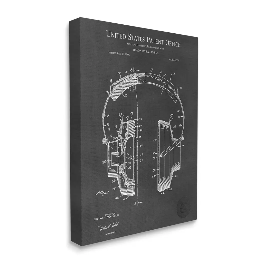 Stupell Detailed Music Headphones Diagram Blueprint Patent Design Canvas Wall Art - Grey - 16 X 20