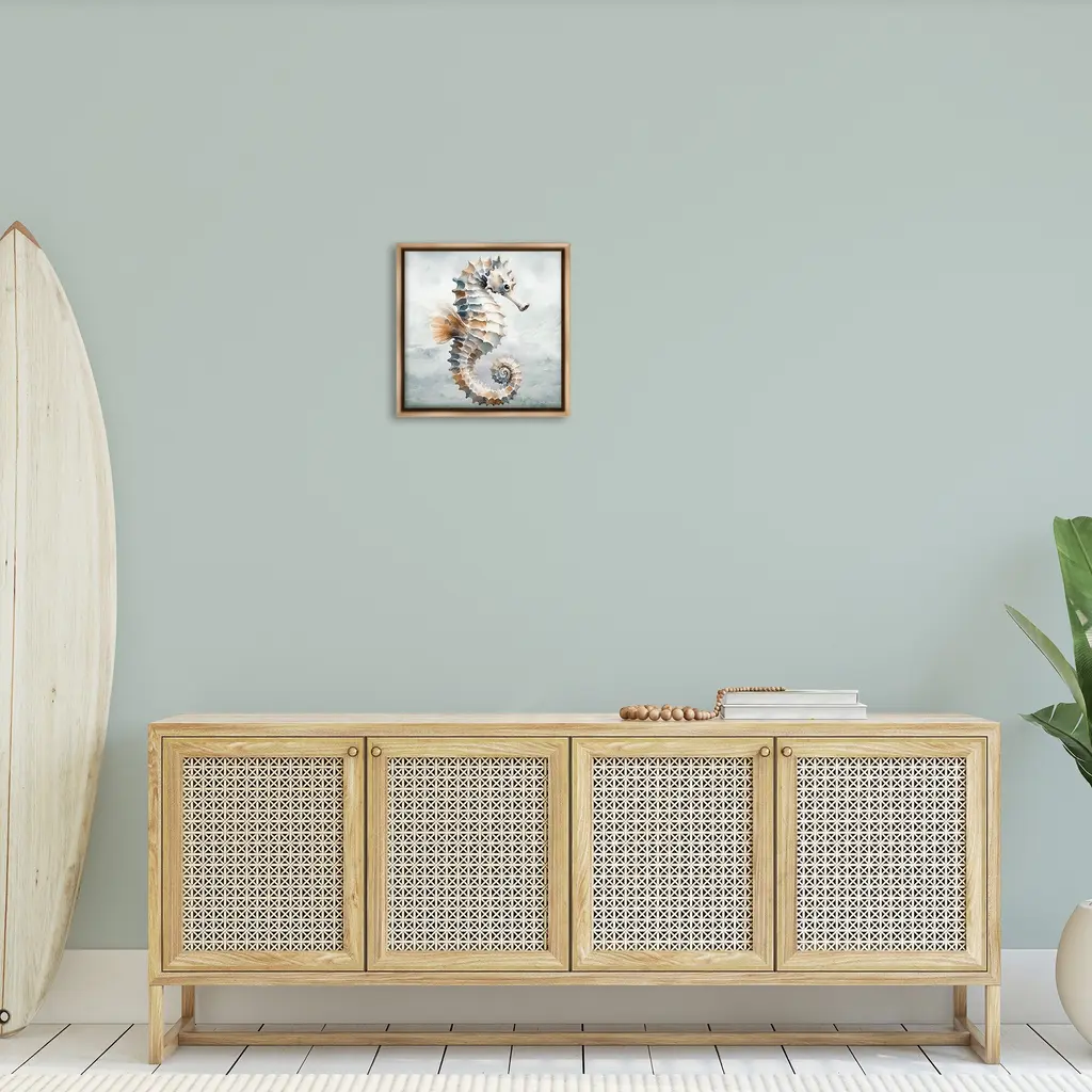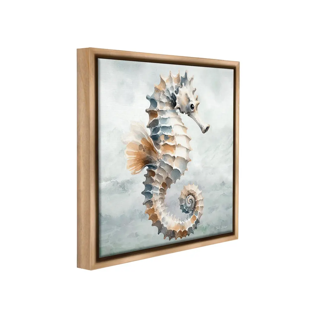 Elevate your home or office to the next level with Stupell Framed Floating Canvas Wall Art. Our premium hand-stretched canvas is mounted securely into a sturdy lightweight frame. The museum-style gap between the wrapped canvas and the box frame gives the illusion of floating artwork. Stupell Wall Art is made in the USA.Features: Dimensions: 18 x 1.7 x 18 Frame, 17 x 1.5 x 17 Canvas ArtFloating Frame Canvas Products are available in sizes 18"x18" and 25"x25". All Floating Frame Canvas Products have a 1.7" Depth.Wall Art is Ready to Hang with Hardware Free Hanging. No Installation required. For Easy Set Up Lean or Layer Artwork on Shelf or Against Wall. Artwork is Permently Fixed into the Frame.Our elevated 1.7" Thick Floating Frame is the perfect complement to our canvas style Wall Art. We use only the highest quality inks in house with industry leading printing solutions. Canvas is hand stretched over a durable wood foundation and then mounted securly into a Modern Box Frame. Made in the USA.Artwork Relates To: Animal, Sea Life, Mammal, Seahorse, Nautical, MaritimeDesign by Nicole Decamp