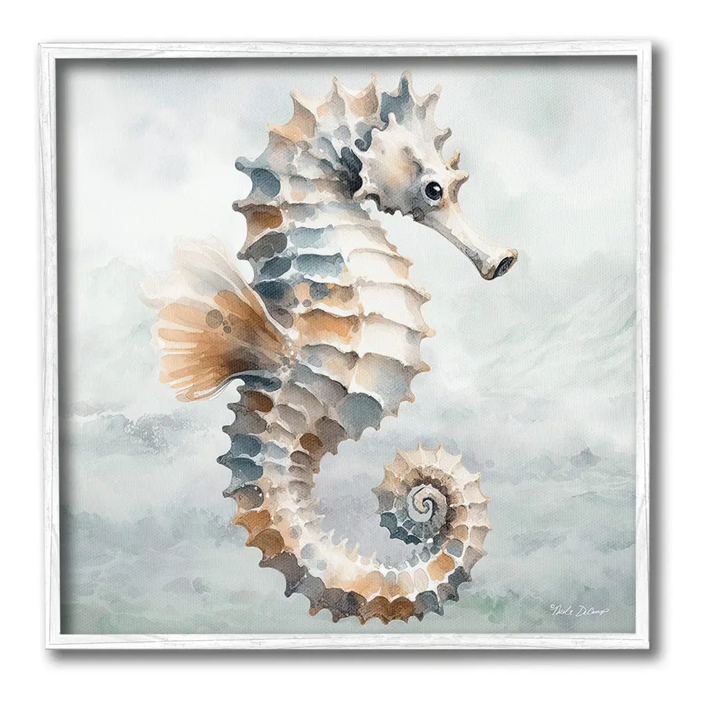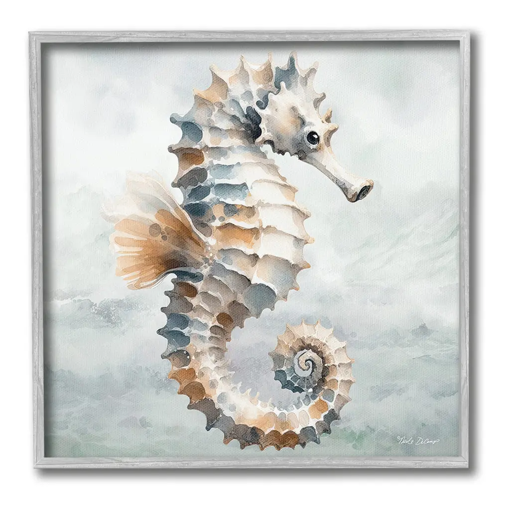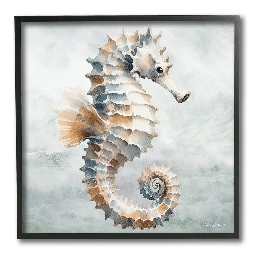 Add dimension to any room with our textured Framed Giclee Artwork. Our framed artwork is securely mounted into a 1.5-inch thick wood grain frame and ready to hang. Frames are available in three alluring styles: black, gray farmhouse and white. In addition, you should check out our oversized options if you want a statement piece. Stupell Wall Art is made in the USA.Features: Dimensions: 12 x 1.5 x 12 FramedFramed Giclee Product Sizes Include 12"x12", 17"x17", and 24"x24". Framed Giclee Products have a 1.5" Depth. Wall Art is Ready to Hang with Hardware Free Hanging. No installation required. For Easy Set Up Lean or Layer Artwork on Shelf or Against Wall.Our giclée prints are carefully mounted on a durable MDF backing, and then perfectly finished in a 1.5 inch thick woodgrain frame. Mounted frame colors include black, gray farmhouse and white. Made In USA.Artwork Relates To: Animal, Sea Life, Mammal, Seahorse, Nautical, MaritimeDesign by Nicole Decamp