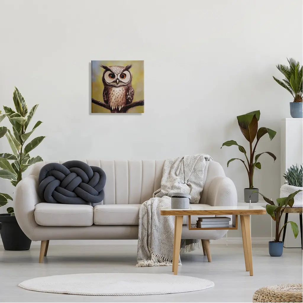 Proudly made in the USA, Our stretched canvas is created with the highest standards. We use only the highest quality inks and canvas on our in house Mimaki printers, and then hand cut and stretch each piece over a 1.5 inch thick wooden frame for hanging. The art comes ready to hang with no installation required.Features: Dimensions: 17 x 1.5 x 17 InchesStretched Canvas Sizes Include Standard: 17 x 1.5 x 17 Large: 24 x 1.5 x 24 X-Large: 30 x 1.5 x 30 Oversized: 36 x 1.5 x 36Wall Art is Ready to Hang - No Installation or Hardware Needed. For Easy Set Up Lean or Layer Artwork on Shelf or Against Wall.Our stretched canvas is created with the highest standards. We use only the highest quality inks and canvas on our in house Mimaki printers, and then hand cut and stretch each piece over a 1.5 inch thick wooden frame for hanging. Made In USA.Artwork Relates To: Bird, Animal, Owl, Beak, Nature, WildlifeDesign by Alpenglow Workshop