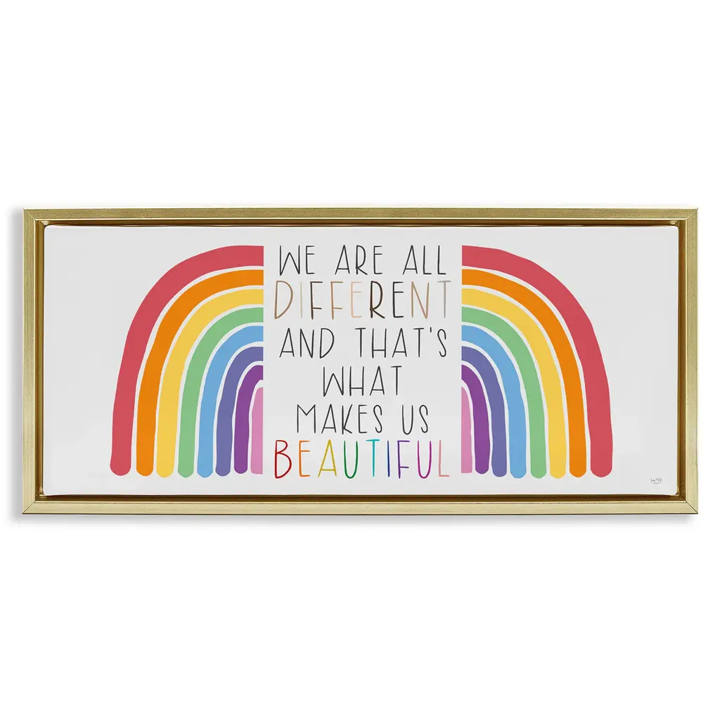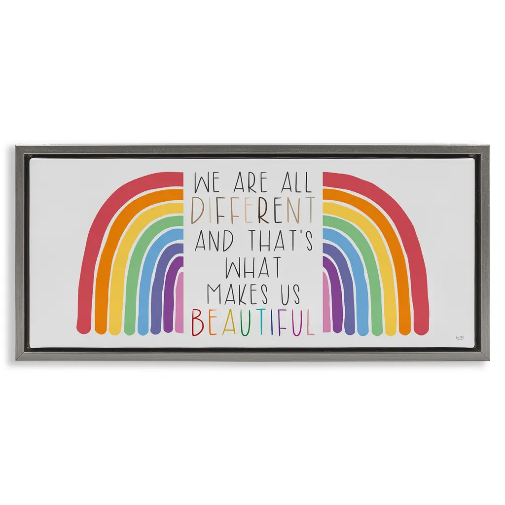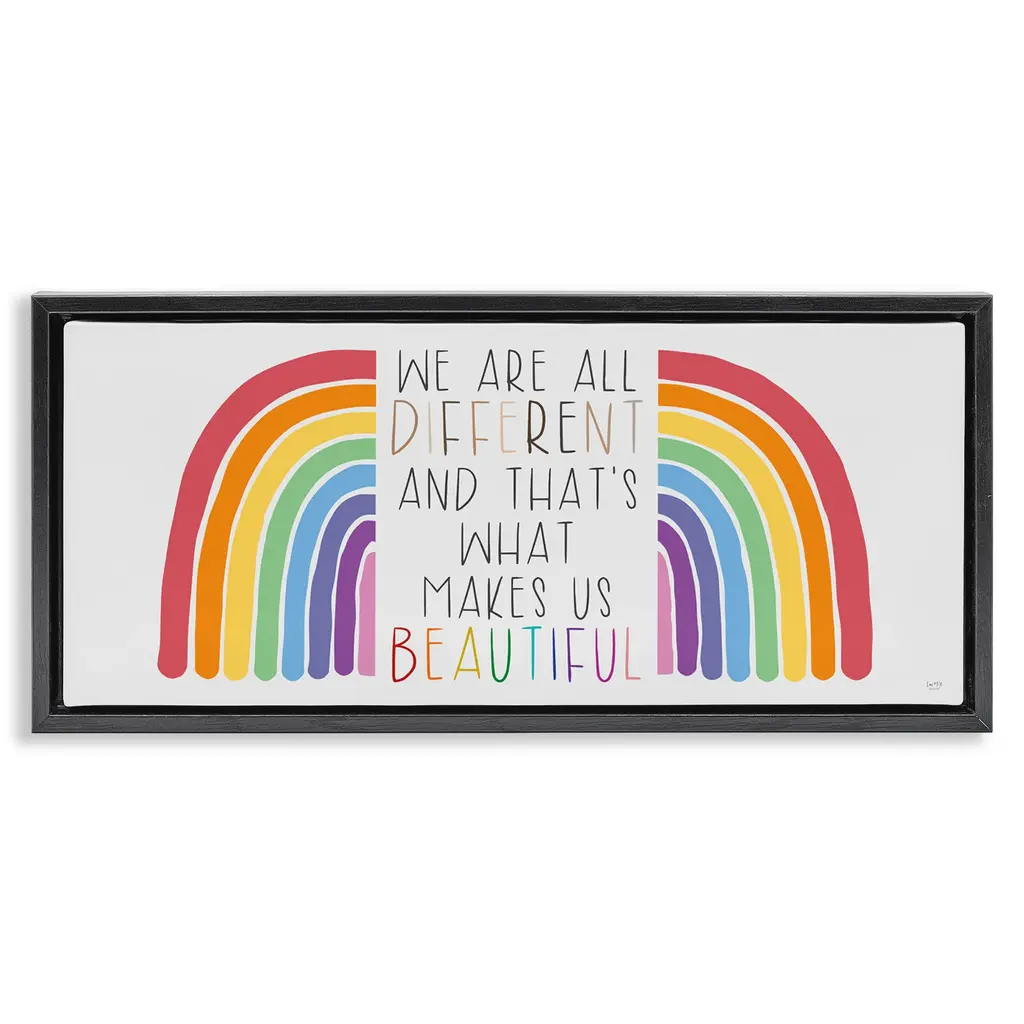 Elevate your home or office to the next level with Stupell Framed Floating Canvas Wall Art. Our premium hand-stretched canvas is mounted securely into a sturdy lightweight frame. The museum-style gap between the wrapped canvas and the box frame gives the illusion of floating artwork. Stupell Wall Art is made in the USA.Features: Dimensions: 25 x 1.7 x 11 Frame, 24 x 1.5 x 10 Canvas ArtFloating Frame Canvas Products are available in sizes 25"x11" and 31"x14". All Floating Frame Canvas Products have a 1.7" Depth.Wall Art is Ready to Hang with Hardware Free Hanging. No Installation required. For Easy Set Up Lean or Layer Artwork on Shelf or Against Wall. Artwork is Permently Fixed into the Frame.Our elevated 1.7" Thick Floating Frame is the perfect complement to our canvas style Wall Art. We use only the highest quality inks in house with industry leading printing solutions. Canvas is hand stretched over a durable wood foundation and then mounted securly into a Modern Box Frame. Made in the USA.Artwork Relates To: Typography, Motivational, Inspirational, Quote, Phrase, Inclusive, Rainbow, DiversityDesign by Lux + Me Designs
