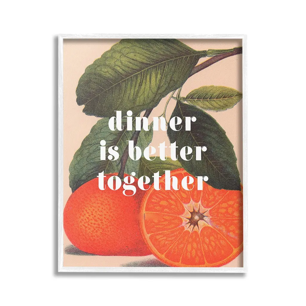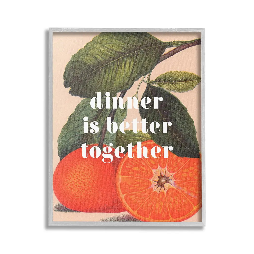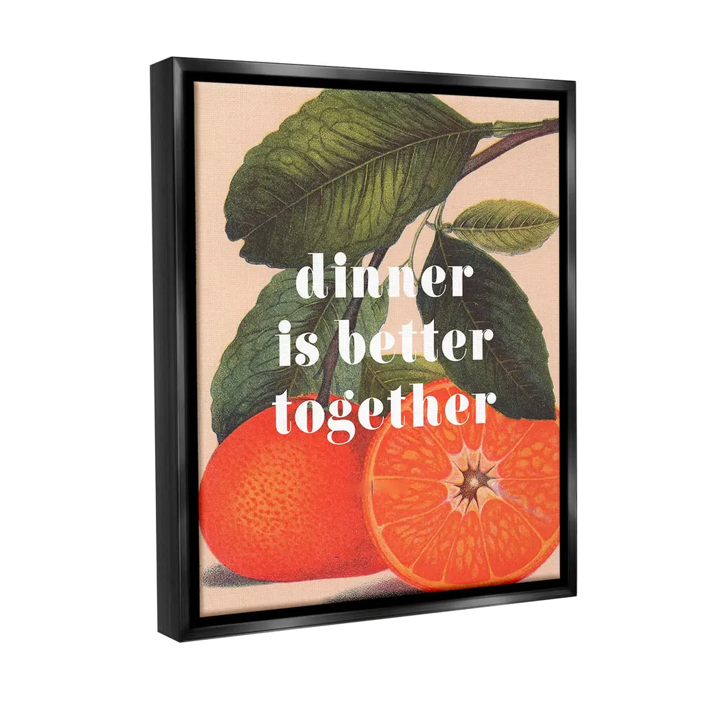 Elevate your home or office to the next level with Stupell Framed Floating Canvas Wall Art. Our premium hand-stretched canvas is mounted securely into a sturdy lightweight frame. The museum-style gap between the wrapped canvas and the box frame gives the illusion of floating artwork. Stupell Wall Art is made in the USA.Features: Dimensions: 17 x 1.7 x 21 Frame, 16 x 1.5 x 20 Canvas ArtFloating Frame Canvas Products are available in sizes 17"x21" and 25"x31". All Floating Frame Canvas Products have a 1.7" Depth.Wall Art is Ready to Hang with Hardware Free Hanging. No Installation required. For Easy Set Up Lean or Layer Artwork on Shelf or Against Wall. Artwork is Permently Fixed into the Frame.Our elevated 1.7" Thick Floating Frame is the perfect complement to our canvas style Wall Art. We use only the highest quality inks in house with industry leading printing solutions. Canvas is hand stretched over a durable wood foundation and then mounted securly into a Modern Box Frame. Made in the USA.Artwork Relates To: Citrus Fruit, Food, Fruit, Plant, Produce, Grapefruit, Dinner Is Better TogetherDesign by Lil' Rue