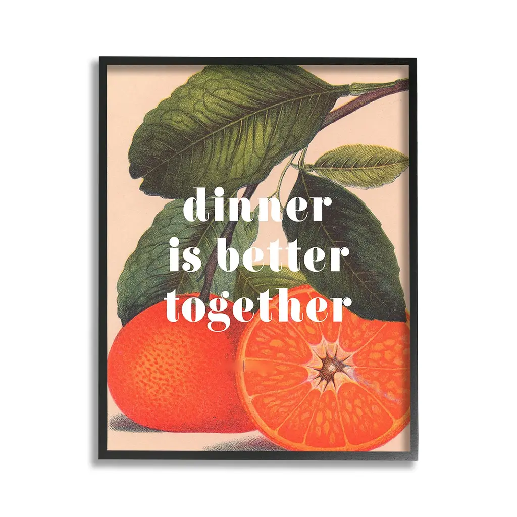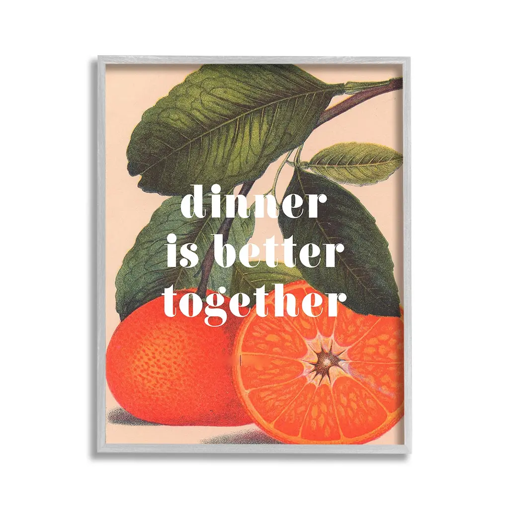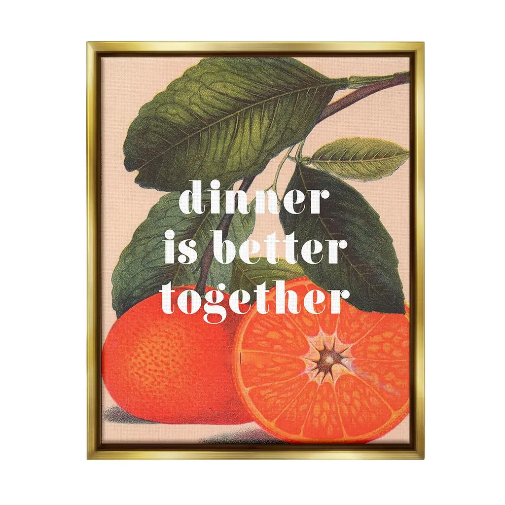 Elevate your home or office to the next level with Stupell Framed Floating Canvas Wall Art. Our premium hand-stretched canvas is mounted securely into a sturdy lightweight frame. The museum-style gap between the wrapped canvas and the box frame gives the illusion of floating artwork. Stupell Wall Art is made in the USA.Features: Dimensions: 17 x 1.7 x 21 Frame, 16 x 1.5 x 20 Canvas ArtFloating Frame Canvas Products are available in sizes 17"x21" and 25"x31". All Floating Frame Canvas Products have a 1.7" Depth.Wall Art is Ready to Hang with Hardware Free Hanging. No Installation required. For Easy Set Up Lean or Layer Artwork on Shelf or Against Wall. Artwork is Permently Fixed into the Frame.Our elevated 1.7" Thick Floating Frame is the perfect complement to our canvas style Wall Art. We use only the highest quality inks in house with industry leading printing solutions. Canvas is hand stretched over a durable wood foundation and then mounted securly into a Modern Box Frame. Made in the USA.Artwork Relates To: Citrus Fruit, Food, Fruit, Plant, Produce, Grapefruit, Dinner Is Better TogetherDesign by Lil' Rue