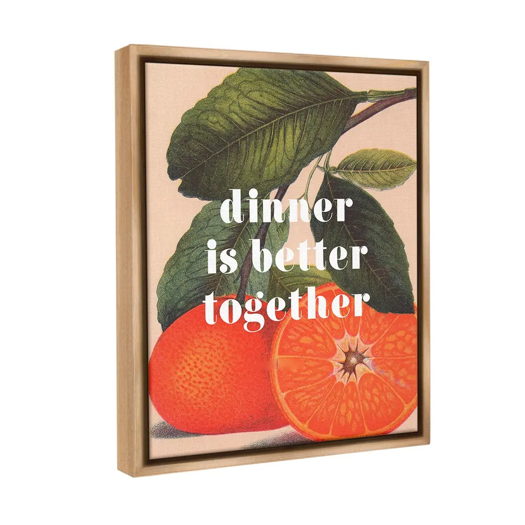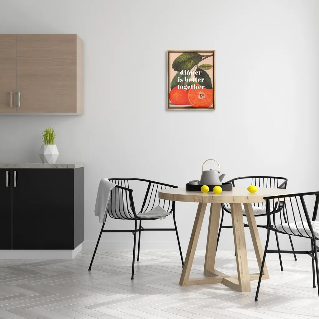 Elevate your home or office to the next level with Stupell Framed Floating Canvas Wall Art. Our premium hand-stretched canvas is mounted securely into a sturdy lightweight frame. The museum-style gap between the wrapped canvas and the box frame gives the illusion of floating artwork. Stupell Wall Art is made in the USA.Features: Dimensions: 17 x 1.7 x 21 Frame, 16 x 1.5 x 20 Canvas ArtFloating Frame Canvas Products are available in sizes 17"x21" and 25"x31". All Floating Frame Canvas Products have a 1.7" Depth.Wall Art is Ready to Hang with Hardware Free Hanging. No Installation required. For Easy Set Up Lean or Layer Artwork on Shelf or Against Wall. Artwork is Permently Fixed into the Frame.Our elevated 1.7" Thick Floating Frame is the perfect complement to our canvas style Wall Art. We use only the highest quality inks in house with industry leading printing solutions. Canvas is hand stretched over a durable wood foundation and then mounted securly into a Modern Box Frame. Made in the USA.Artwork Relates To: Citrus Fruit, Food, Fruit, Plant, Produce, Grapefruit, Dinner Is Better TogetherDesign by Lil' Rue