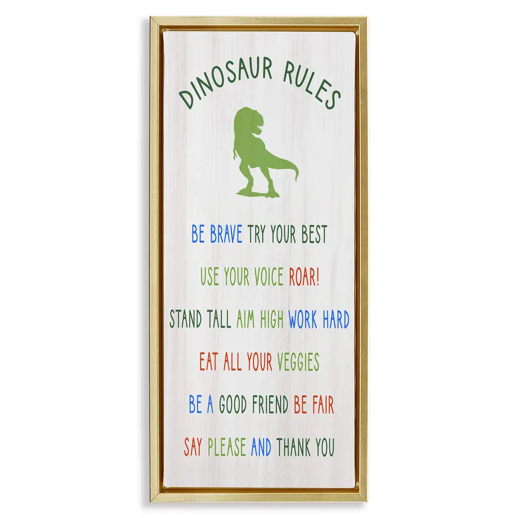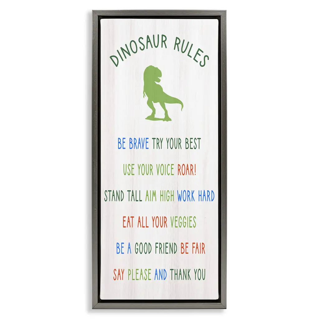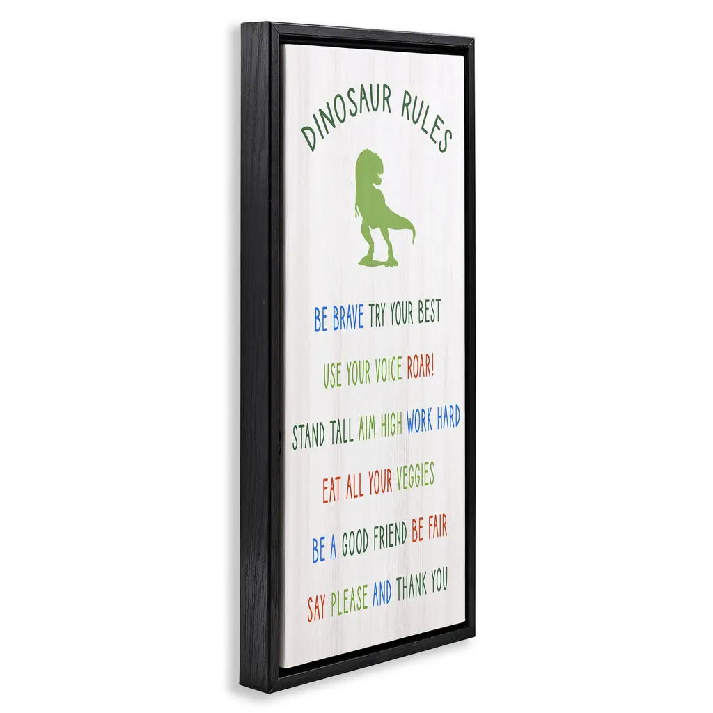 Elevate your home or office to the next level with Stupell Framed Floating Canvas Wall Art. Our premium hand-stretched canvas is mounted securely into a sturdy lightweight frame. The museum-style gap between the wrapped canvas and the box frame gives the illusion of floating artwork. Stupell Wall Art is made in the USA.Features: Dimensions: 11 x 1.7 x 25 Frame, 10 x 1.5 x 24 Canvas ArtFloating Frame Canvas Products are available in sizes 11"x25" and 14"x31". All Floating Frame Canvas Products have a 1.7" Depth.Wall Art is Ready to Hang with Hardware Free Hanging. No Installation required. For Easy Set Up Lean or Layer Artwork on Shelf or Against Wall. Artwork is Permently Fixed into the Frame.Our elevated 1.7" Thick Floating Frame is the perfect complement to our canvas style Wall Art. We use only the highest quality inks in house with industry leading printing solutions. Canvas is hand stretched over a durable wood foundation and then mounted securly into a Modern Box Frame. Made in the USA.Artwork Relates To: Kids, Motivational, Parenting, Children, Family, DinosaurDesign by Daphne Polselli