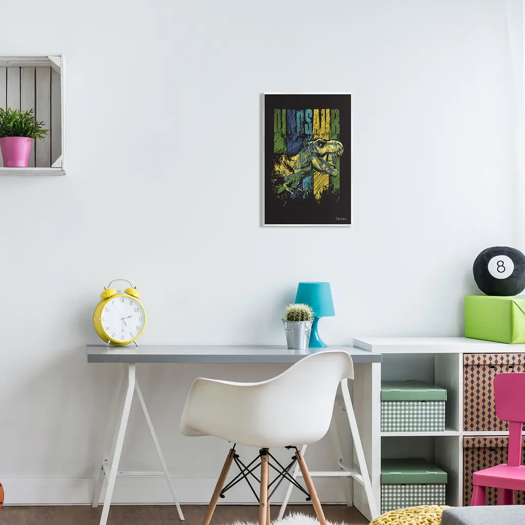 Our wall plaques start as high-quality lithograph prints mounted on durable 0.5-inch thick MDF wood. Each piece is hand finished and comes with a fresh layer of white foil on the sides to give it a crisp, clean look. Plaques arrive ready to hang without installation and come with removable plastic corners to keep them from damage in transit. Stupell Wall Art is made in the USA.Features: Dimensions: 10 x 0.5 x 15 InchesWall Plaque Sizes Include Standard: 10 x 0.5 x 15 Oversized: 13 x 0.5 x 19Wall Art is Ready to Hang with Hardware Free Hanging. No installation required. For Easy Set Up Lean or Layer Artwork on Shelf or Against Wall.All of our wall plaques start off as high quality lithograph prints that are then mounted on durable 0.5 inch thick MDF wood. Each piece is hand finished and comes with a fresh layer of foil on the sides to give it a crisp clean look. Made In USA.Artwork Relates To: Animal, Dinosaur, Reptile, T-RexDesign by Nidhi Wadhwa