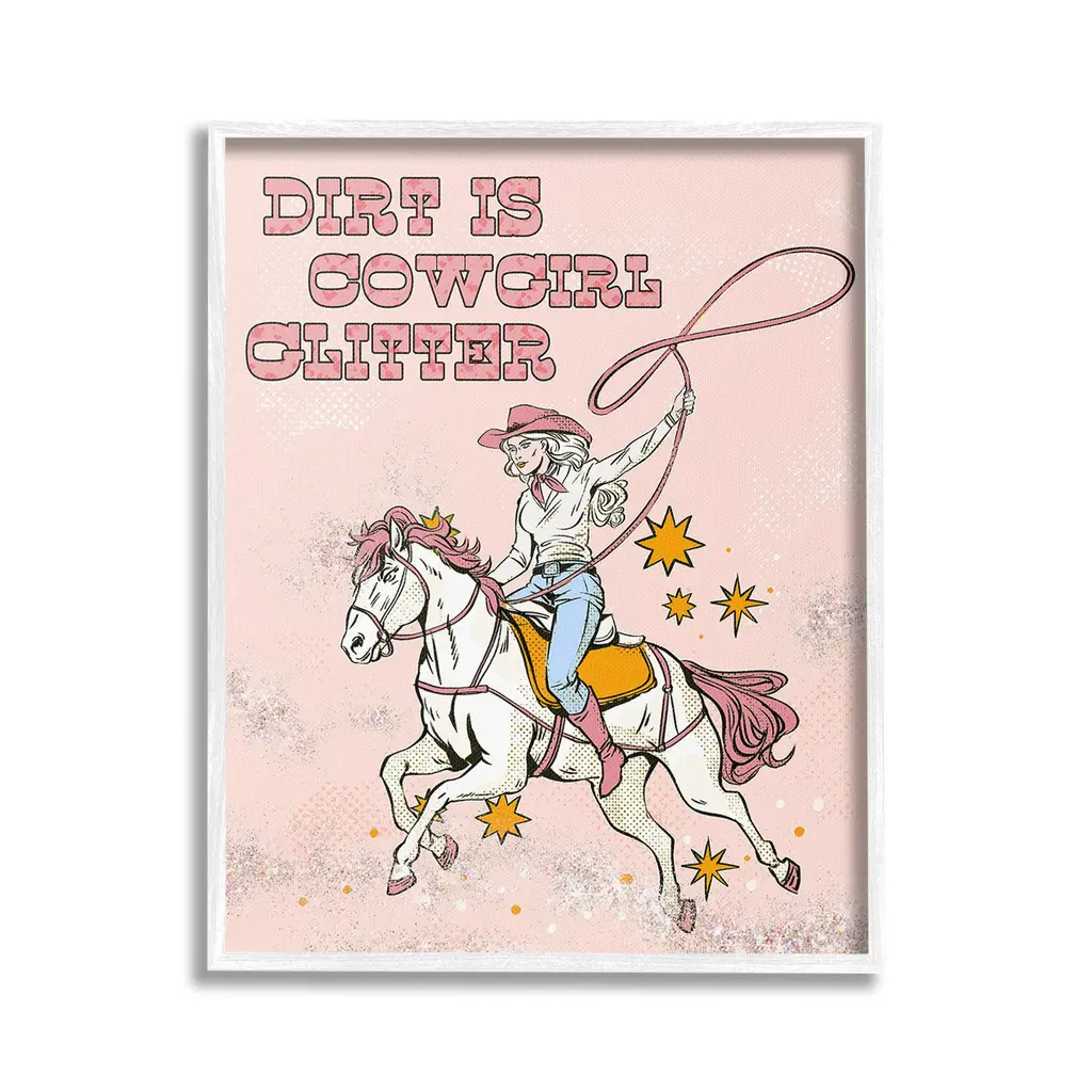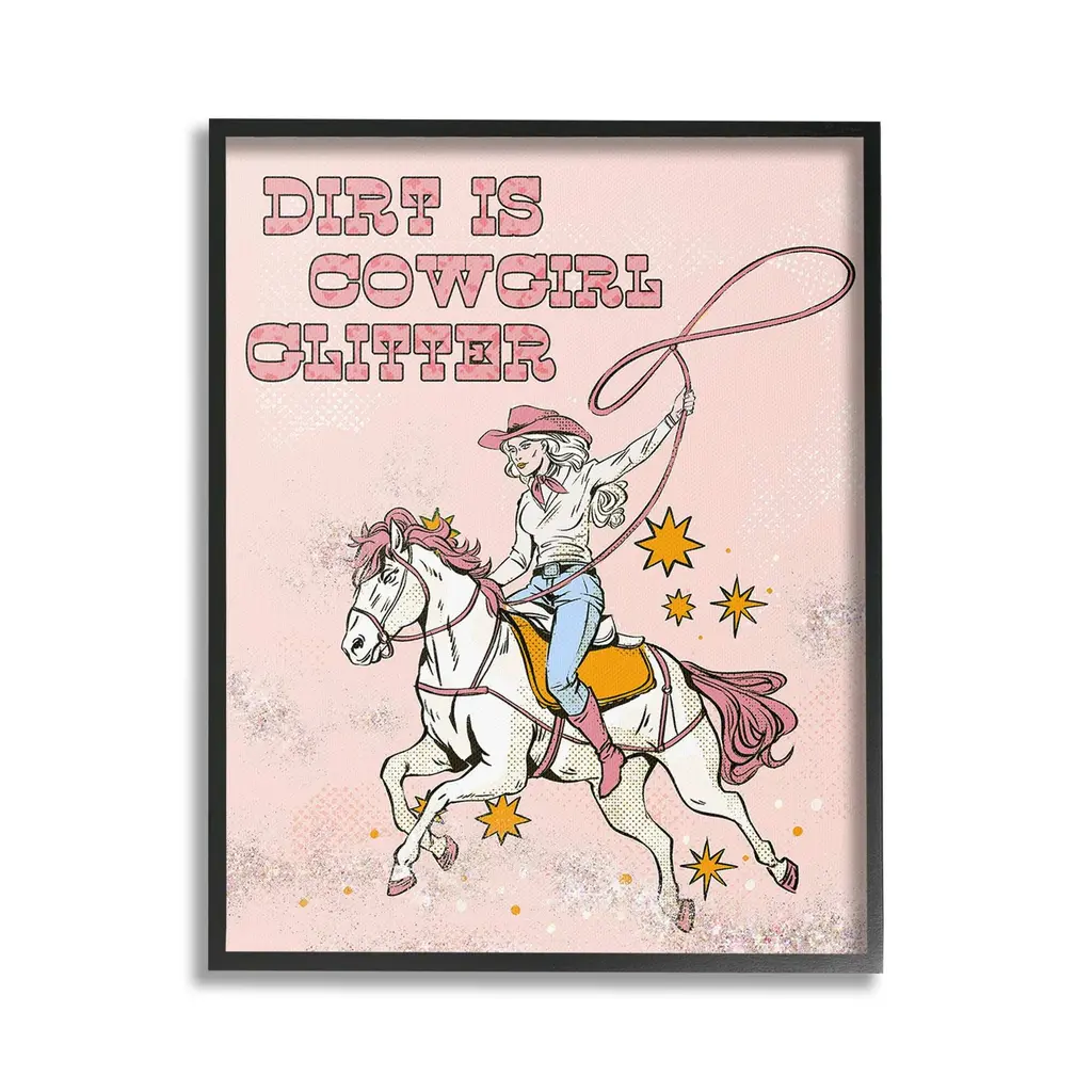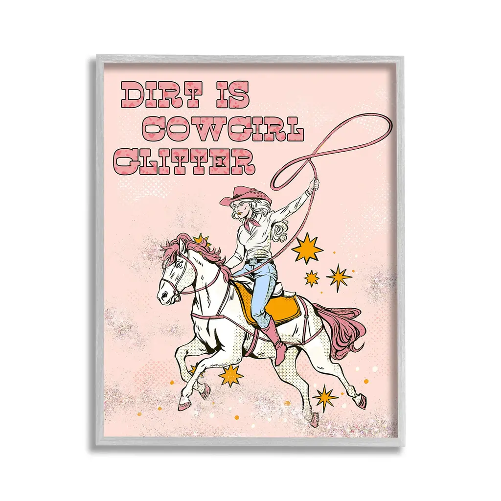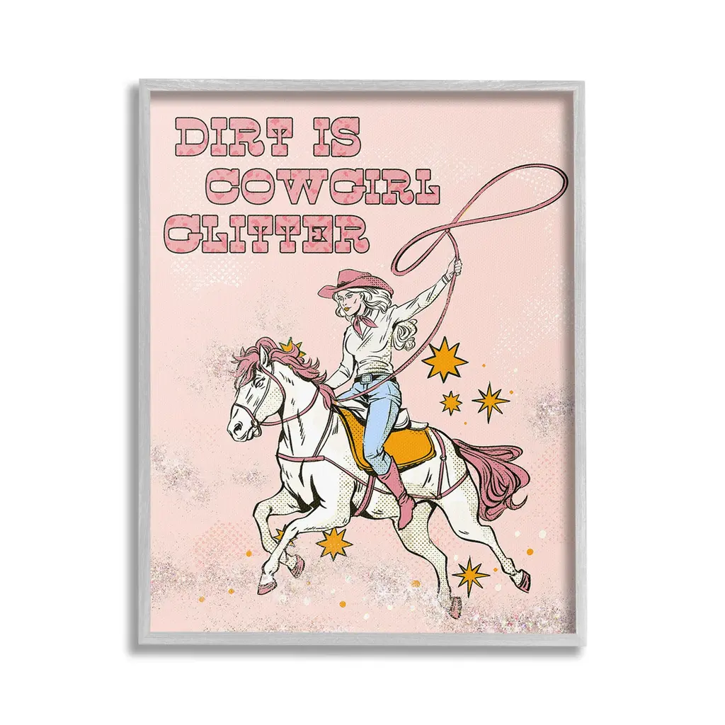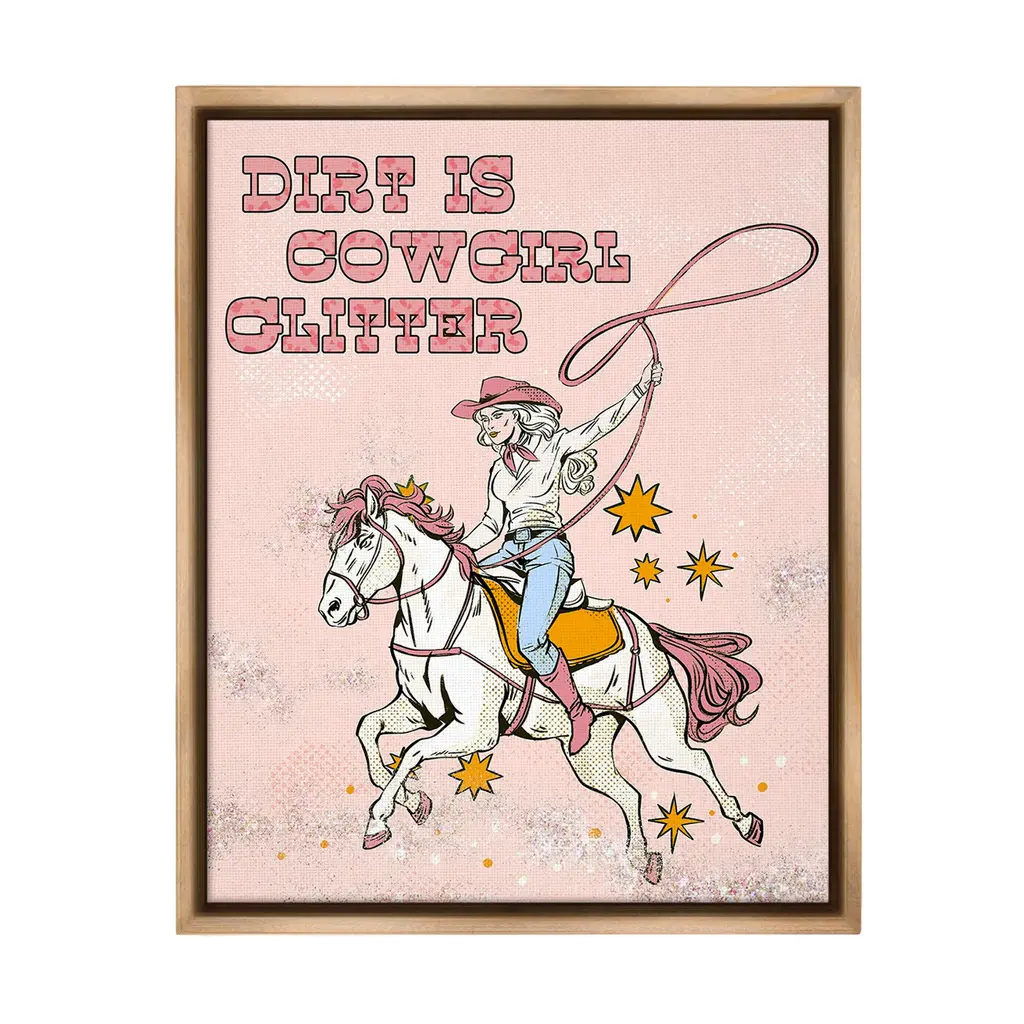 Elevate your home or office to the next level with Stupell Framed Floating Canvas Wall Art. Our premium hand-stretched canvas is mounted securely into a sturdy lightweight frame. The museum-style gap between the wrapped canvas and the box frame gives the illusion of floating artwork. Stupell Wall Art is made in the USA.Features: Dimensions: 17 x 1.7 x 21 Frame, 16 x 1.5 x 20 Canvas ArtFloating Frame Canvas Products are available in sizes 17"x21" and 25"x31". All Floating Frame Canvas Products have a 1.7" Depth.Wall Art is Ready to Hang with Hardware Free Hanging. No Installation required. For Easy Set Up Lean or Layer Artwork on Shelf or Against Wall. Artwork is Permently Fixed into the Frame.Our elevated 1.7" Thick Floating Frame is the perfect complement to our canvas style Wall Art. We use only the highest quality inks in house with industry leading printing solutions. Canvas is hand stretched over a durable wood foundation and then mounted securly into a Modern Box Frame. Made in the USA.Artwork Relates To: Equestrian, Rodeo, Country, Southwestern, Cowgirl, Animal, Horse, Racing, Galloping, Vintage, Dirt is Cowgirl GlitterDesign by Ziwei Li