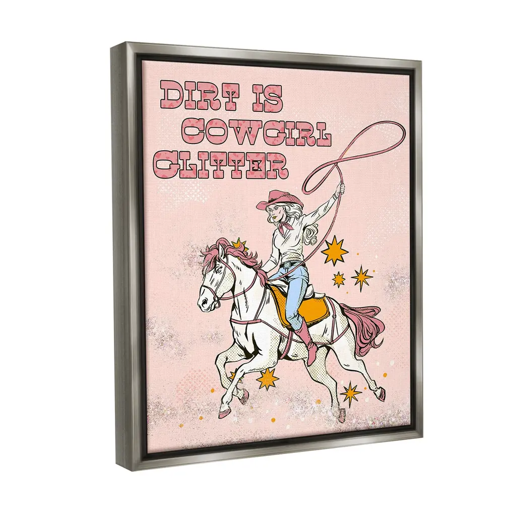 Elevate your home or office to the next level with Stupell Framed Floating Canvas Wall Art. Our premium hand-stretched canvas is mounted securely into a sturdy lightweight frame. The museum-style gap between the wrapped canvas and the box frame gives the illusion of floating artwork. Stupell Wall Art is made in the USA.Features: Dimensions: 17 x 1.7 x 21 Frame, 16 x 1.5 x 20 Canvas ArtFloating Frame Canvas Products are available in sizes 17"x21" and 25"x31". All Floating Frame Canvas Products have a 1.7" Depth.Wall Art is Ready to Hang with Hardware Free Hanging. No Installation required. For Easy Set Up Lean or Layer Artwork on Shelf or Against Wall. Artwork is Permently Fixed into the Frame.Our elevated 1.7" Thick Floating Frame is the perfect complement to our canvas style Wall Art. We use only the highest quality inks in house with industry leading printing solutions. Canvas is hand stretched over a durable wood foundation and then mounted securly into a Modern Box Frame. Made in the USA.Artwork Relates To: Equestrian, Rodeo, Country, Southwestern, Cowgirl, Animal, Horse, Racing, Galloping, Vintage, Dirt is Cowgirl GlitterDesign by Ziwei Li