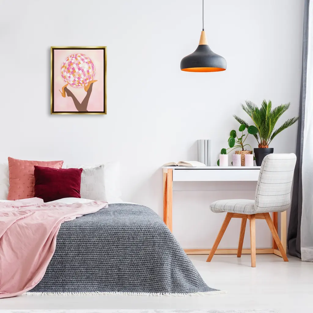 Elevate your home or office to the next level with Stupell Framed Floating Canvas Wall Art. Our premium hand-stretched canvas is mounted securely into a sturdy lightweight frame. The museum-style gap between the wrapped canvas and the box frame gives the illusion of floating artwork. Stupell Wall Art is made in the USA.Features: Dimensions: 17 x 1.7 x 21 Frame, 16 x 1.5 x 20 Canvas ArtFloating Frame Sizes Include Standard: 17 x 1.7 x 21 Oversized: 25 x 1.7 x 31Wall Art is Ready to Hang - No Installation or Hardware Needed. For Easy Set Up Lean or Layer Artwork on Shelf or Against Wall.Our elevated 1.7" Thick Floating Frame is the perfect complement to our canvas style Wall Art. We use only the highest quality inks in house with industry leading printing solutions. Canvas is hand stretched over a durable wood foundation and then mounted securly into a Modern Box Frame. Made in the USA.Artwork Relates To: Disco Ball, Retro, Bold, High HeelsDesign by Martina Pavlova