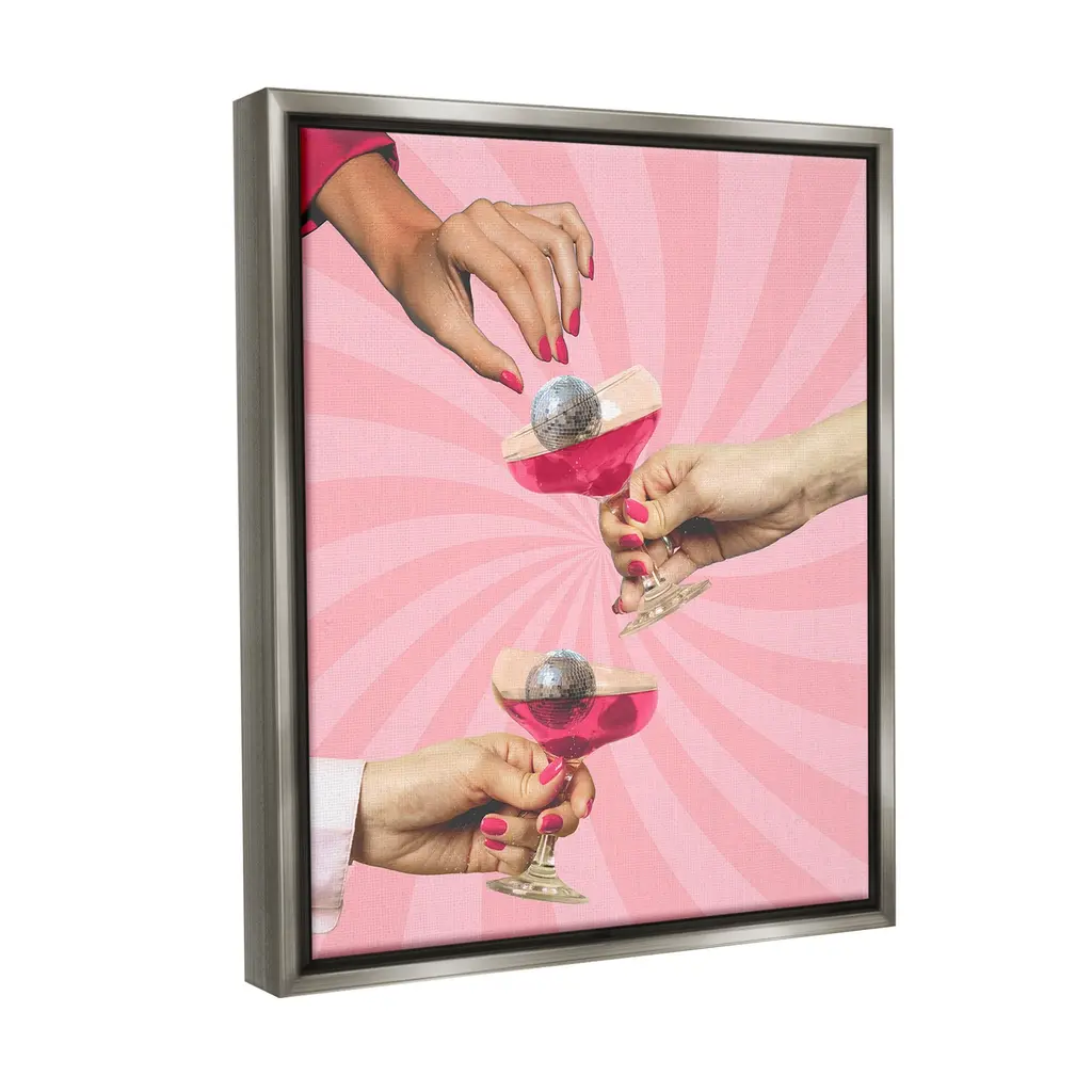 Elevate your home or office to the next level with Stupell Framed Floating Canvas Wall Art. Our premium hand-stretched canvas is mounted securely into a sturdy lightweight frame. The museum-style gap between the wrapped canvas and the box frame gives the illusion of floating artwork. Stupell Wall Art is made in the USA.Features: Dimensions: 17 x 1.7 x 21 Frame, 16 x 1.5 x 20 Canvas ArtFloating Frame Canvas Products are available in sizes 17"x21" and 25"x31". All Floating Frame Canvas Products have a 1.7" Depth.Wall Art is Ready to Hang with Hardware Free Hanging. No Installation required. For Easy Set Up Lean or Layer Artwork on Shelf or Against Wall. Artwork is Permently Fixed into the Frame.Our elevated 1.7" Thick Floating Frame is the perfect complement to our canvas style Wall Art. We use only the highest quality inks in house with industry leading printing solutions. Canvas is hand stretched over a durable wood foundation and then mounted securly into a Modern Box Frame. Made in the USA.Artwork Relates To: Dance, Music, Disco, Pattern, Abstract, Shape, Modern, Glam, Person, Hand, Cocktail, MartiniDesign by Lil' Rue