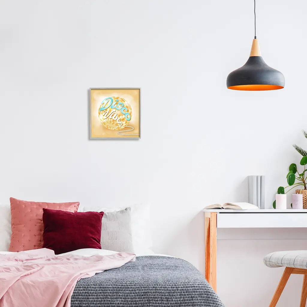 Add dimension to any room with our textured Framed Giclee Artwork. Our framed artwork is securely mounted into a 1.5-inch thick wood grain frame and ready to hang. Frames are available in three alluring styles: black, gray farmhouse and white. In addition, you should check out our oversized options if you want a statement piece. Stupell Wall Art is made in the USA.Features: Dimensions: 12 x 1.5 x 12 FramedFramed Giclee Sizes Include Standard: 12 x 1.5 x 12 Large: 17 x 1.5 x 17 Oversized: 24 x 1.5 x 24Wall Art is Ready to Hang - No Installation or Hardware Needed. For Easy Set Up Lean or Layer Artwork on Shelf or Against Wall.Our giclée prints are carefully mounted on a durable MDF backing, and then perfectly finished in a 1.5 inch thick woodgrain frame. Mounted frame colors include black, gray farmhouse and white. Made In USA.Artwork Relates To: Disco Ball, Retro, Bold, Disco VibesDesign by Martina Pavlova