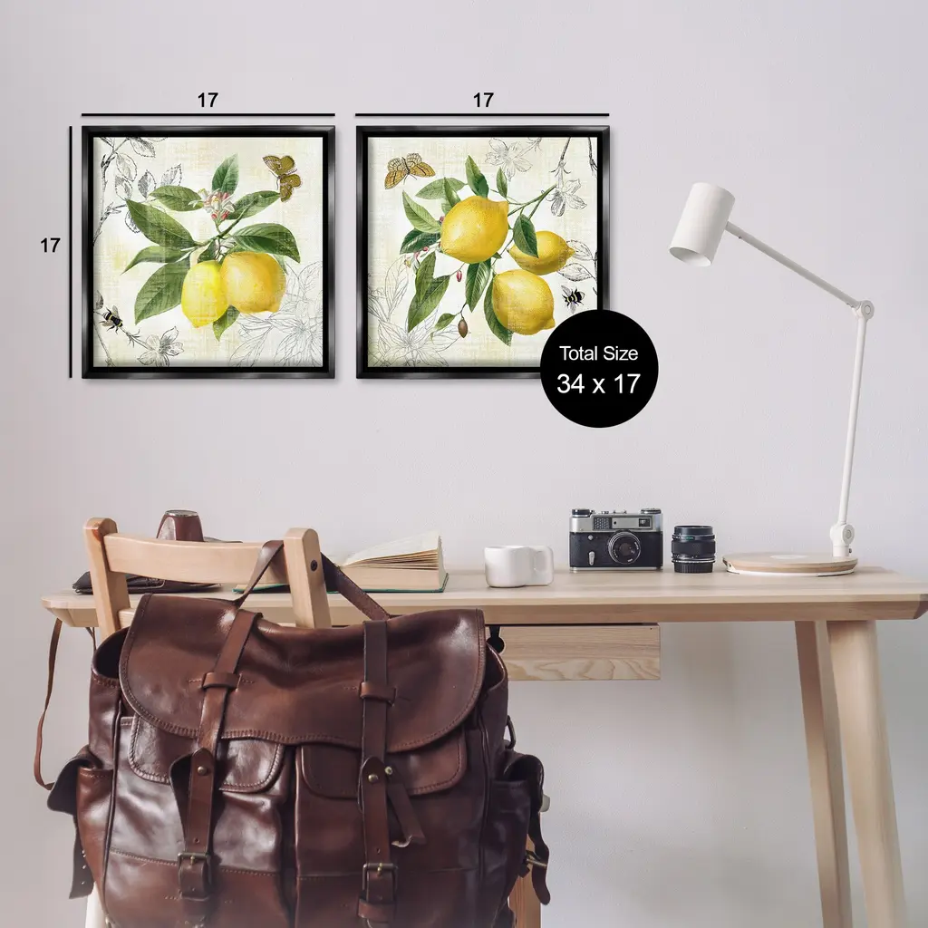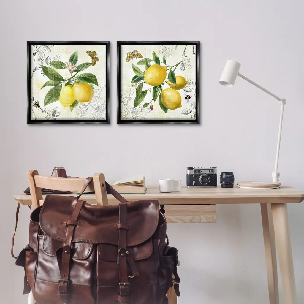 Elevate your home or office to the next level with Stupell Framed Floating Canvas Wall Art. Our premium hand-stretched canvas is mounted securely into a sturdy lightweight frame. The museum-style gap between the wrapped canvas and the box frame gives the illusion of floating artwork. Stupell Wall Art is made in the USA.Features: Dimensions: 2 Piece Set, Each Frame is 18 x 1.7 x 18Two Piece Floating Frame Canvas Products are available as 18"x18" or 25"x25" Panels. All Floating Frame Canvas Products have a 1.7" Depth.Wall Art is Ready to Hang with Hardware Free Hanging. No Installation required. For Easy Set Up Lean or Layer Artwork on Shelf or Against Wall. Artwork is Permently Fixed into the Frame.Our elevated 1.7" Thick Floating Frame is the perfect complement to our canvas style Wall Art. We use only the highest quality inks in house with industry leading printing solutions. Canvas is hand stretched over a durable wood foundation and then mounted securly into a Modern Box Frame. Made in the USA.Artwork Relates To: Citrus Fruit, Food, Fruit, Lemon, Plant, Animal, Bee, Insect, Pattern, Floral, Flower, Vintage, ButterflyDesign by Nan