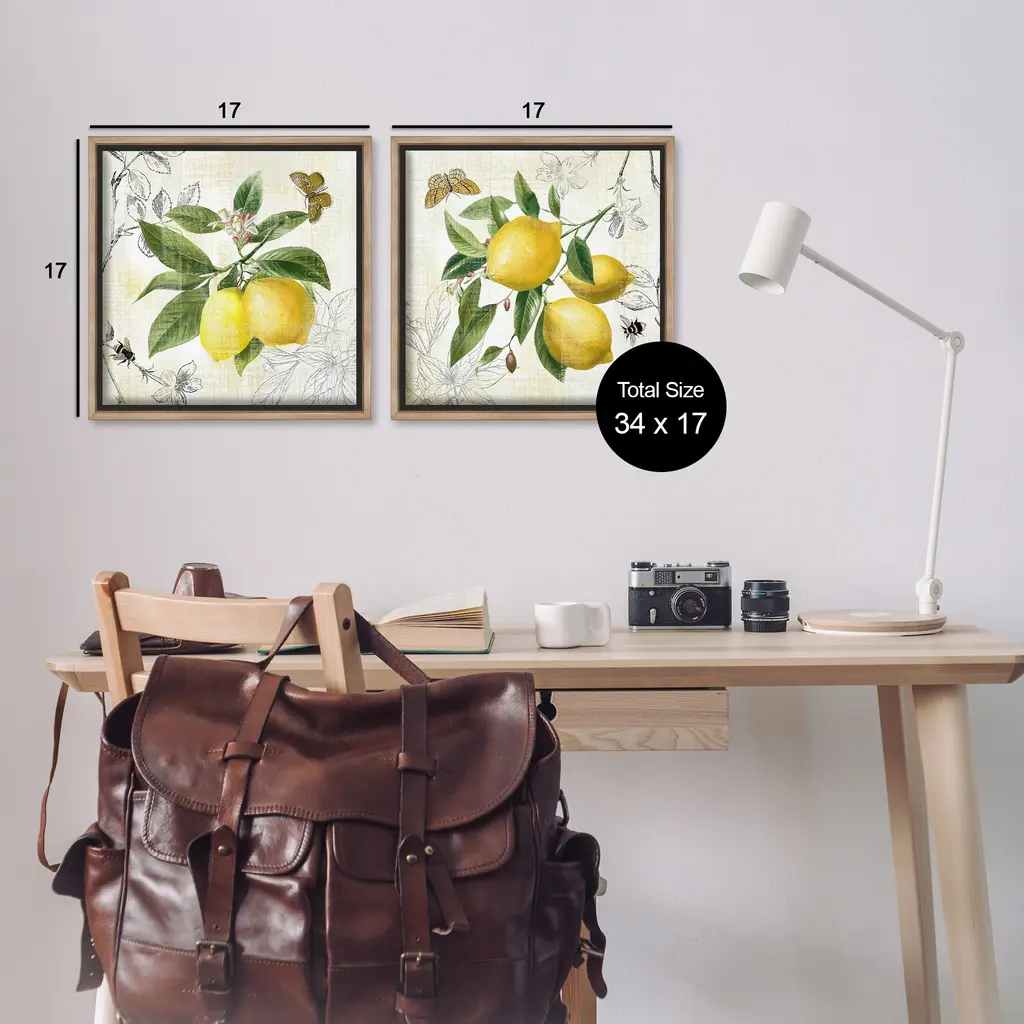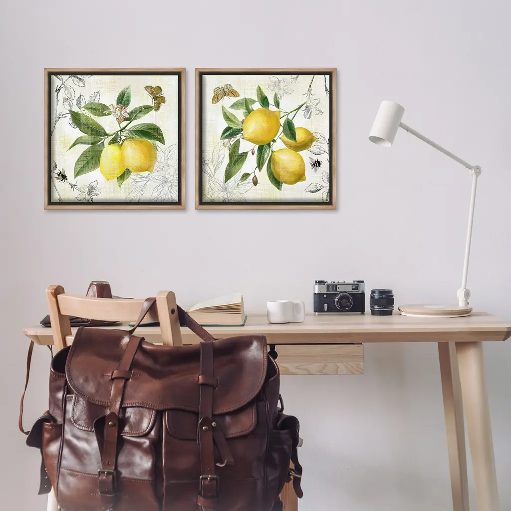 Elevate your home or office to the next level with Stupell Framed Floating Canvas Wall Art. Our premium hand-stretched canvas is mounted securely into a sturdy lightweight frame. The museum-style gap between the wrapped canvas and the box frame gives the illusion of floating artwork. Stupell Wall Art is made in the USA.Features: Dimensions: 2 Piece Set, Each Frame is 18 x 1.7 x 18Two Piece Floating Frame Canvas Products are available as 18"x18" or 25"x25" Panels. All Floating Frame Canvas Products have a 1.7" Depth.Wall Art is Ready to Hang with Hardware Free Hanging. No Installation required. For Easy Set Up Lean or Layer Artwork on Shelf or Against Wall. Artwork is Permently Fixed into the Frame.Our elevated 1.7" Thick Floating Frame is the perfect complement to our canvas style Wall Art. We use only the highest quality inks in house with industry leading printing solutions. Canvas is hand stretched over a durable wood foundation and then mounted securly into a Modern Box Frame. Made in the USA.Artwork Relates To: Citrus Fruit, Food, Fruit, Lemon, Plant, Animal, Bee, Insect, Pattern, Floral, Flower, Vintage, ButterflyDesign by Nan