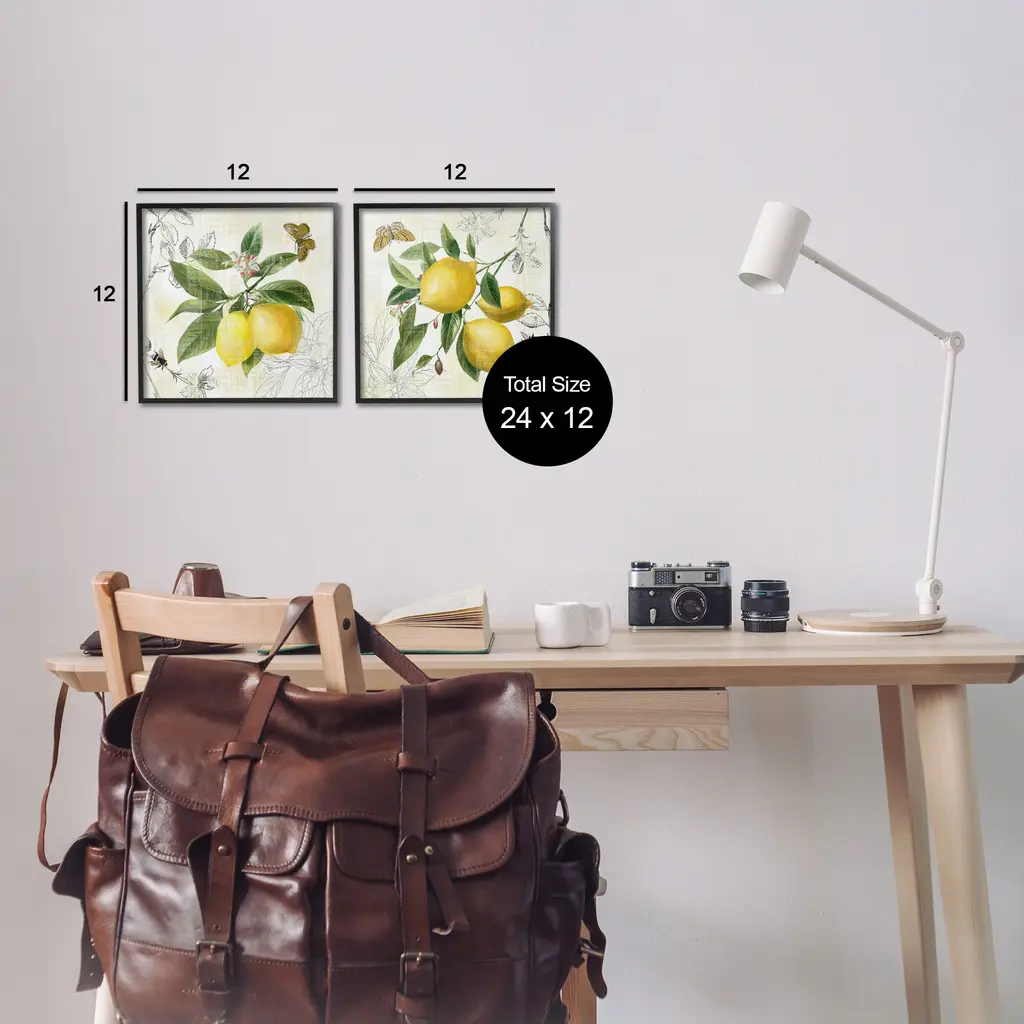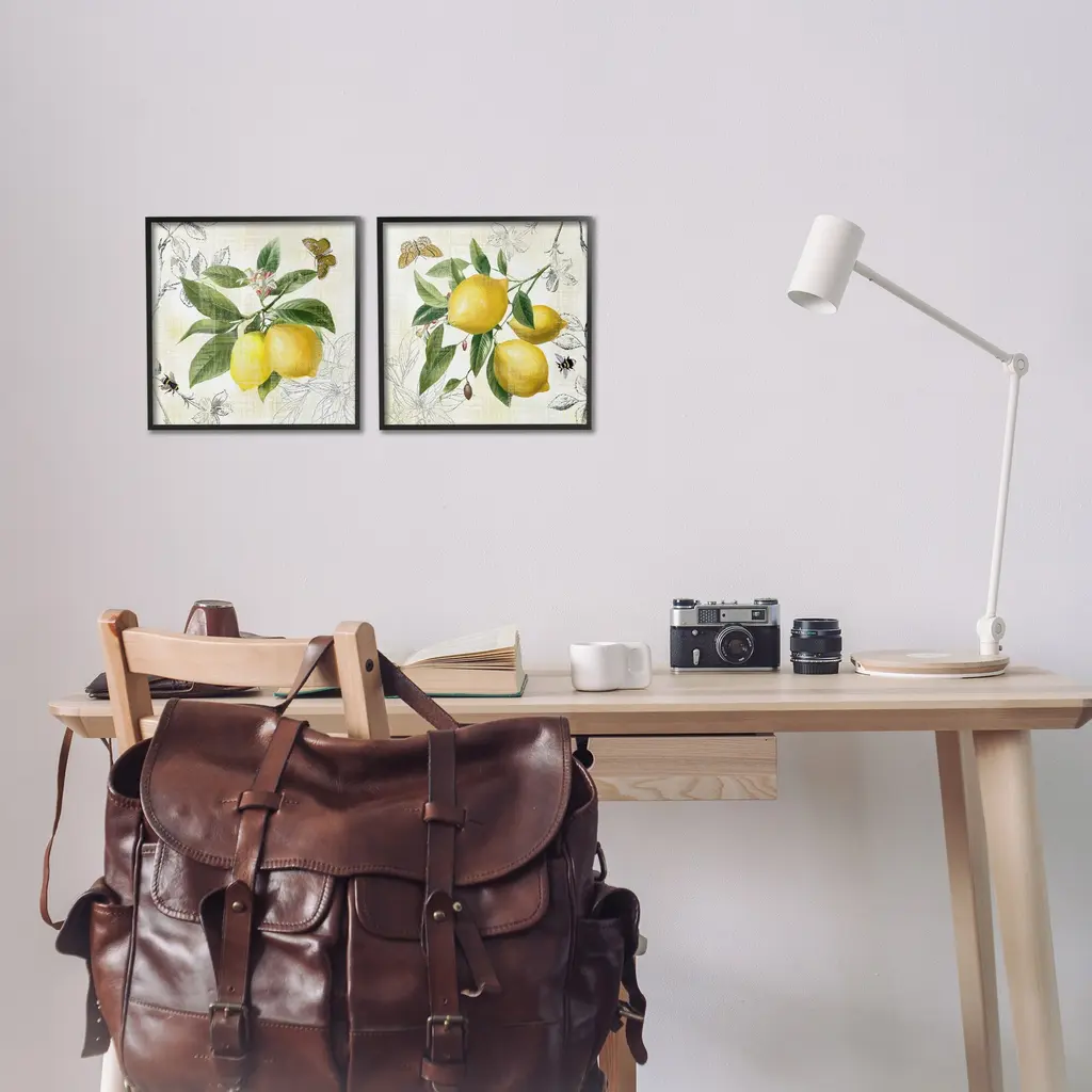 Fill any space in your home or office with our Framed Wall Art Sets. Our framed artwork is securely mounted into a 1.5-inch thick wood grain frame and ready to hang. Frames are available in three alluring styles: black, gray farmhouse and white. Stupell Wall Art is made in the USA.Features: Dimensions: 2 Piece Set, Each Panel is 12 x 1.5 x 12 FramedTwo Piece Framed Giclee Sets are available as 12"x12", 17"x17" or 24"x24" Panels. All Framed giclee Products have a 1.5" Depth.Wall Art is Ready to Hang with Hardware Free Hanging. No installation required. For Easy Set Up Lean or Layer Artwork on Shelf or Against Wall.Curated Wall Art Sets make it easy for you complete the theme for any room. Our giclée prints are carefully mounted on a durable MDF backing, and then perfectly finished in a 1.5 inch thick woodgrain frame. Mounted frame colors include black, gray farmhouse and white. Made In USA.Artwork Relates To: Citrus Fruit, Food, Fruit, Lemon, Plant, Animal, Bee, Insect, Pattern, Floral, Flower, Vintage, ButterflyDesign by Nan