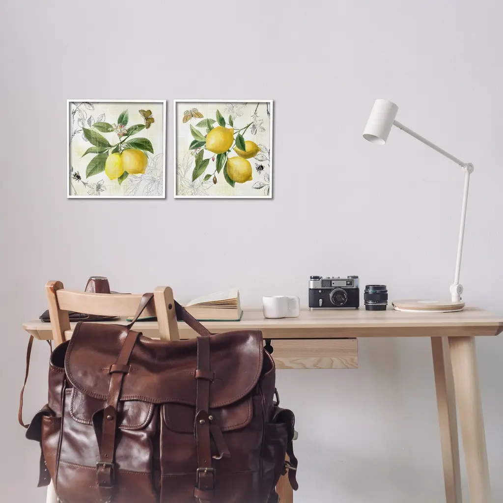 Fill any space in your home or office with our Framed Wall Art Sets. Our framed artwork is securely mounted into a 1.5-inch thick wood grain frame and ready to hang. Frames are available in three alluring styles: black, gray farmhouse and white. Stupell Wall Art is made in the USA.Features: Dimensions: 2 Piece Set, Each Panel is 12 x 1.5 x 12 FramedTwo Piece Framed Giclee Sets are available as 12"x12", 17"x17" or 24"x24" Panels. All Framed giclee Products have a 1.5" Depth.Wall Art is Ready to Hang with Hardware Free Hanging. No installation required. For Easy Set Up Lean or Layer Artwork on Shelf or Against Wall.Curated Wall Art Sets make it easy for you complete the theme for any room. Our giclée prints are carefully mounted on a durable MDF backing, and then perfectly finished in a 1.5 inch thick woodgrain frame. Mounted frame colors include black, gray farmhouse and white. Made In USA.Artwork Relates To: Citrus Fruit, Food, Fruit, Lemon, Plant, Animal, Bee, Insect, Pattern, Floral, Flower, Vintage, ButterflyDesign by Nan