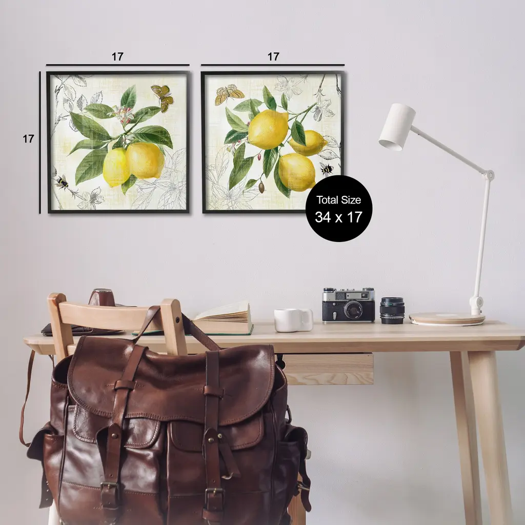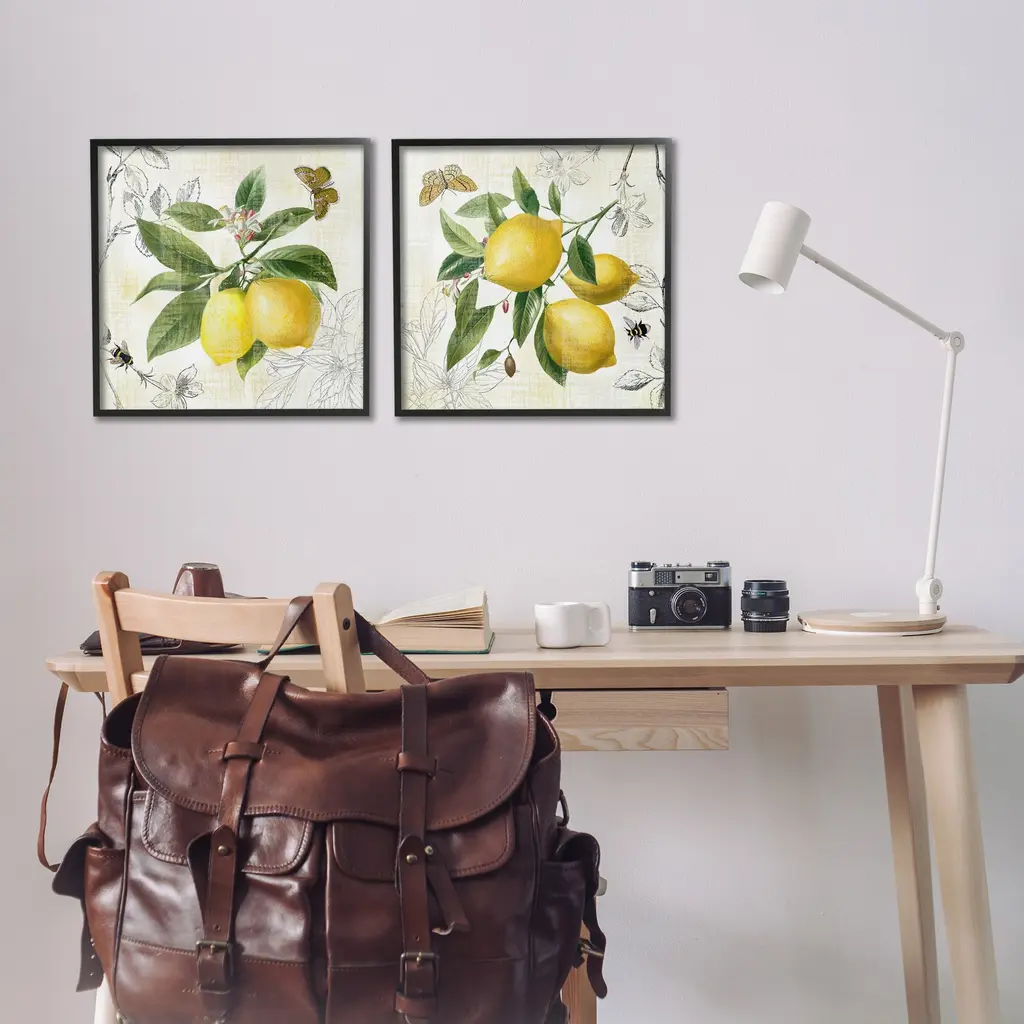 Fill any space in your home or office with our Framed Wall Art Sets. Our framed artwork is securely mounted into a 1.5-inch thick wood grain frame and ready to hang. Frames are available in three alluring styles: black, gray farmhouse and white. Stupell Wall Art is made in the USA.Features: Dimensions: 2 Piece Set, Each Panel is 12 x 1.5 x 12 FramedTwo Piece Framed Giclee Sets are available as 12"x12", 17"x17" or 24"x24" Panels. All Framed giclee Products have a 1.5" Depth.Wall Art is Ready to Hang with Hardware Free Hanging. No installation required. For Easy Set Up Lean or Layer Artwork on Shelf or Against Wall.Curated Wall Art Sets make it easy for you complete the theme for any room. Our giclée prints are carefully mounted on a durable MDF backing, and then perfectly finished in a 1.5 inch thick woodgrain frame. Mounted frame colors include black, gray farmhouse and white. Made In USA.Artwork Relates To: Citrus Fruit, Food, Fruit, Lemon, Plant, Animal, Bee, Insect, Pattern, Floral, Flower, Vintage, ButterflyDesign by Nan