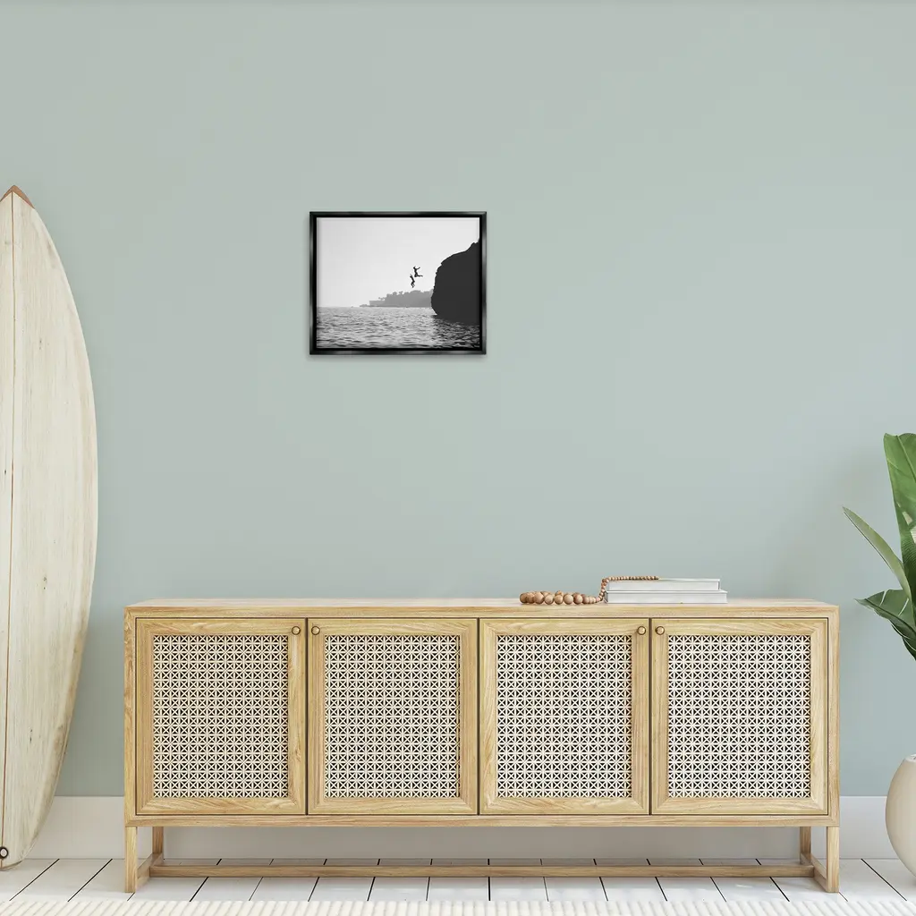 Elevate your home or office to the next level with Stupell Framed Floating Canvas Wall Art. Our premium hand-stretched canvas is mounted securely into a sturdy lightweight frame. The museum-style gap between the wrapped canvas and the box frame gives the illusion of floating artwork. Stupell Wall Art is made in the USA.Features: Dimensions: 21 x 1.7 x 17 Frame, 20 x 1.5 x 16 Canvas ArtFloating Frame Canvas Products are available in sizes 21"x17" and 31"x25". All Floating Frame Canvas Products have a 1.7" Depth.Wall Art is Ready to Hang with Hardware Free Hanging. No Installation required. For Easy Set Up Lean or Layer Artwork on Shelf or Against Wall. Artwork is Permently Fixed into the Frame.Our elevated 1.7" Thick Floating Frame is the perfect complement to our canvas style Wall Art. We use only the highest quality inks in house with industry leading printing solutions. Canvas is hand stretched over a durable wood foundation and then mounted securly into a Modern Box Frame. Made in the USA.Artwork Relates To: Water, Person, Diving, Cliff, Nature, Swimming, People, Photography, MonochromeDesign by Sisi and Seb