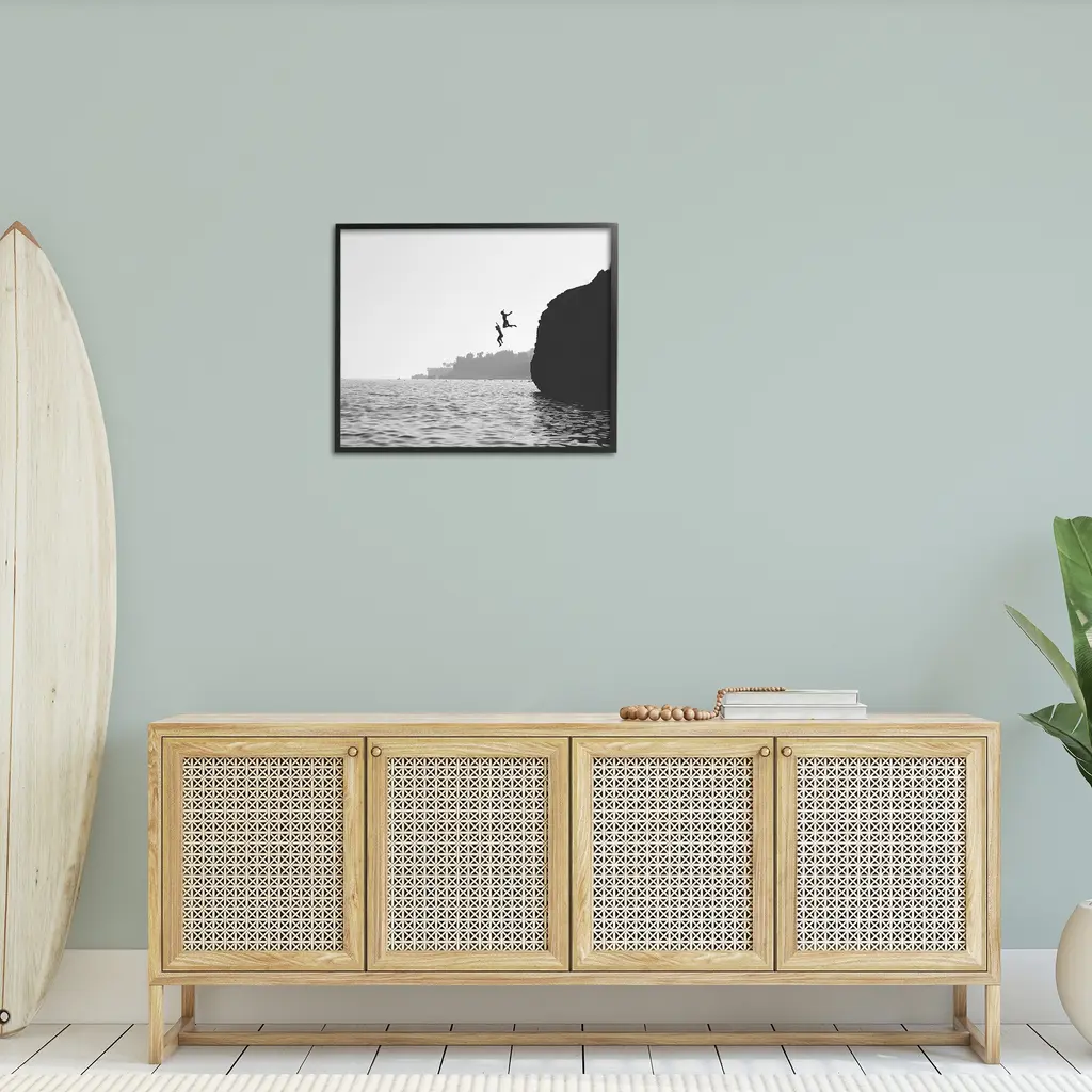 Add dimension to any room with our textured Framed Giclee Artwork. Our framed artwork is securely mounted into a 1.5-inch thick wood grain frame and ready to hang. Frames are available in three alluring styles: black, gray farmhouse and white. In addition, you should check out our oversized options if you want a statement piece. Stupell Wall Art is made in the USA.Features: Dimensions: 14 x 1.5 x 11 FramedFramed Giclee Products are available in the sizes 14"x11", 20"x16" or 30"x24". All Framed Giclee Products have a 1.5" Depth. Wall Art is Ready to Hang with Hardware Free Hanging. No installation required. For Easy Set Up Lean or Layer Artwork on Shelf or Against Wall.Our giclée prints are carefully mounted on a durable MDF backing, and then perfectly finished in a 1.5 inch thick woodgrain frame. Mounted frame colors include black, gray farmhouse and white. Made In USA.Artwork Relates To: Water, Person, Diving, Cliff, Nature, Swimming, People, Photography, MonochromeDesign by Sisi and Seb