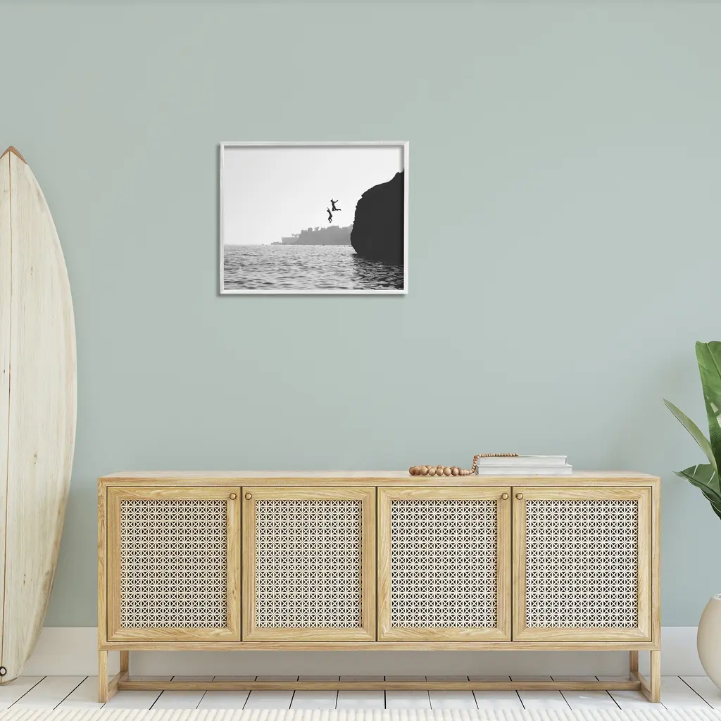 Add dimension to any room with our textured Framed Giclee Artwork. Our framed artwork is securely mounted into a 1.5-inch thick wood grain frame and ready to hang. Frames are available in three alluring styles: black, gray farmhouse and white. In addition, you should check out our oversized options if you want a statement piece. Stupell Wall Art is made in the USA.Features: Dimensions: 14 x 1.5 x 11 FramedFramed Giclee Products are available in the sizes 14"x11", 20"x16" or 30"x24". All Framed Giclee Products have a 1.5" Depth. Wall Art is Ready to Hang with Hardware Free Hanging. No installation required. For Easy Set Up Lean or Layer Artwork on Shelf or Against Wall.Our giclée prints are carefully mounted on a durable MDF backing, and then perfectly finished in a 1.5 inch thick woodgrain frame. Mounted frame colors include black, gray farmhouse and white. Made In USA.Artwork Relates To: Water, Person, Diving, Cliff, Nature, Swimming, People, Photography, MonochromeDesign by Sisi and Seb