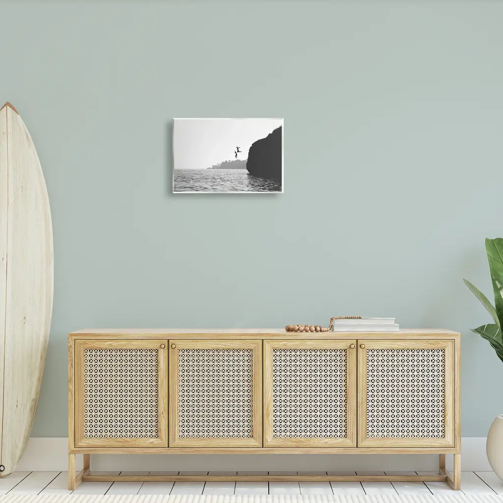 Our wall plaques start as high-quality lithograph prints mounted on durable 0.5-inch thick MDF wood. Each piece is hand finished and comes with a fresh layer of white foil on the sides to give it a crisp, clean look. Plaques arrive ready to hang without installation and come with removable plastic corners to keep them from damage in transit. Stupell Wall Art is made in the USA.Features: Dimensions: 15 x 0.5 x 10 InchesWall Plaque Product Sizes Include 15"x10" and 19"x13". All wall plaque products have a 0.5" Depth. Wall Art is Ready to Hang with Hardware Free Hanging. No installation required. For Easy Set Up Lean or Layer Artwork on Shelf or Against Wall.All of our wall plaques start off as high quality lithograph prints that are then mounted on durable 0.5 inch thick MDF wood. Each piece is hand finished and comes with a fresh layer of foil on the sides to give it a crisp clean look. Made In USA.Artwork Relates To: Water, Person, Diving, Cliff, Nature, Swimming, People, Photography, MonochromeDesign by Sisi and Seb
