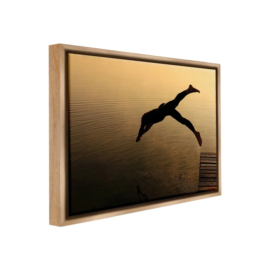 Elevate your home or office to the next level with Stupell Framed Floating Canvas Wall Art. Our premium hand-stretched canvas is mounted securely into a sturdy lightweight frame. The museum-style gap between the wrapped canvas and the box frame gives the illusion of floating artwork. Stupell Wall Art is made in the USA.Features: Dimensions: 21 x 1.7 x 17 Frame, 20 x 1.5 x 16 Canvas ArtFloating Frame Canvas Products are available in sizes 21"x17" and 31"x25". All Floating Frame Canvas Products have a 1.7" Depth.Wall Art is Ready to Hang with Hardware Free Hanging. No Installation required. For Easy Set Up Lean or Layer Artwork on Shelf or Against Wall. Artwork is Permently Fixed into the Frame.Our elevated 1.7" Thick Floating Frame is the perfect complement to our canvas style Wall Art. We use only the highest quality inks in house with industry leading printing solutions. Canvas is hand stretched over a durable wood foundation and then mounted securly into a Modern Box Frame. Made in the USA.Artwork Relates To: Water, Person, Diving, Swimming, Silhouette, Photography, Dock, Lake, BeachDesign by Lil' Rue