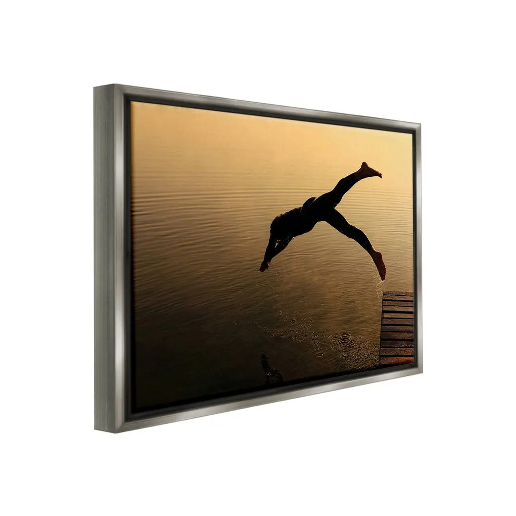 Elevate your home or office to the next level with Stupell Framed Floating Canvas Wall Art. Our premium hand-stretched canvas is mounted securely into a sturdy lightweight frame. The museum-style gap between the wrapped canvas and the box frame gives the illusion of floating artwork. Stupell Wall Art is made in the USA.Features: Dimensions: 21 x 1.7 x 17 Frame, 20 x 1.5 x 16 Canvas ArtFloating Frame Canvas Products are available in sizes 21"x17" and 31"x25". All Floating Frame Canvas Products have a 1.7" Depth.Wall Art is Ready to Hang with Hardware Free Hanging. No Installation required. For Easy Set Up Lean or Layer Artwork on Shelf or Against Wall. Artwork is Permently Fixed into the Frame.Our elevated 1.7" Thick Floating Frame is the perfect complement to our canvas style Wall Art. We use only the highest quality inks in house with industry leading printing solutions. Canvas is hand stretched over a durable wood foundation and then mounted securly into a Modern Box Frame. Made in the USA.Artwork Relates To: Water, Person, Diving, Swimming, Silhouette, Photography, Dock, Lake, BeachDesign by Lil' Rue