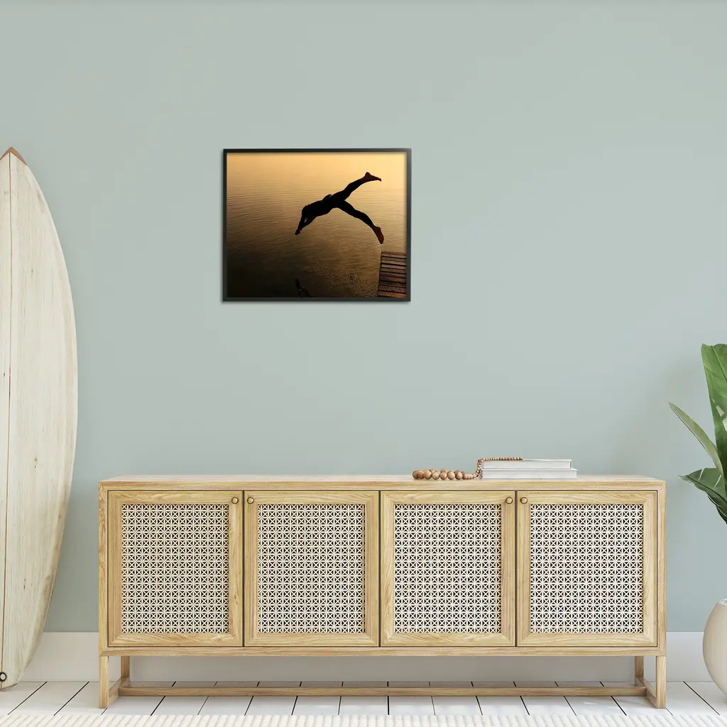 Add dimension to any room with our textured Framed Giclee Artwork. Our framed artwork is securely mounted into a 1.5-inch thick wood grain frame and ready to hang. Frames are available in three alluring styles: black, gray farmhouse and white. In addition, you should check out our oversized options if you want a statement piece. Stupell Wall Art is made in the USA.Features: Dimensions: 14 x 1.5 x 11 FramedFramed Giclee Products are available in the sizes 14"x11", 20"x16" or 30"x24". All Framed Giclee Products have a 1.5" Depth. Wall Art is Ready to Hang with Hardware Free Hanging. No installation required. For Easy Set Up Lean or Layer Artwork on Shelf or Against Wall.Our giclée prints are carefully mounted on a durable MDF backing, and then perfectly finished in a 1.5 inch thick woodgrain frame. Mounted frame colors include black, gray farmhouse and white. Made In USA.Artwork Relates To: Water, Person, Diving, Swimming, Silhouette, Photography, Dock, Lake, BeachDesign by Lil' Rue