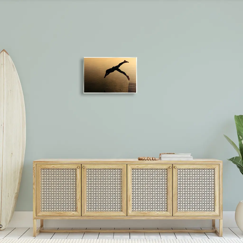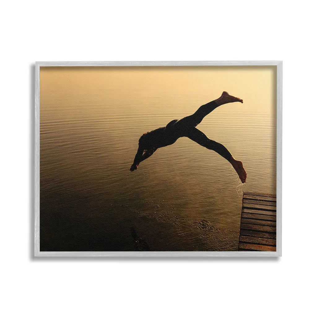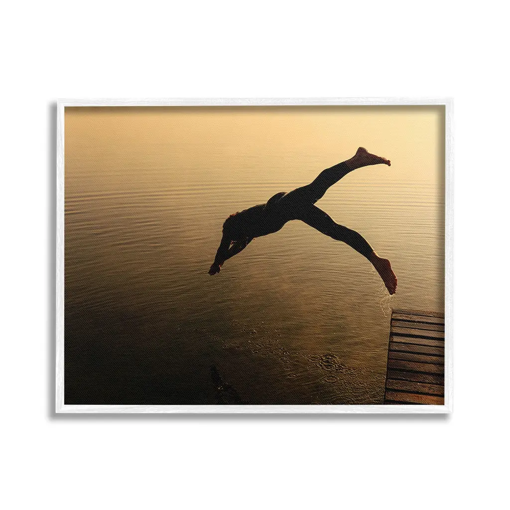 Our wall plaques start as high-quality lithograph prints mounted on durable 0.5-inch thick MDF wood. Each piece is hand finished and comes with a fresh layer of white foil on the sides to give it a crisp, clean look. Plaques arrive ready to hang without installation and come with removable plastic corners to keep them from damage in transit. Stupell Wall Art is made in the USA.Features: Dimensions: 15 x 0.5 x 10 InchesWall Plaque Product Sizes Include 15"x10" and 19"x13". All wall plaque products have a 0.5" Depth. Wall Art is Ready to Hang with Hardware Free Hanging. No installation required. For Easy Set Up Lean or Layer Artwork on Shelf or Against Wall.All of our wall plaques start off as high quality lithograph prints that are then mounted on durable 0.5 inch thick MDF wood. Each piece is hand finished and comes with a fresh layer of foil on the sides to give it a crisp clean look. Made In USA.Artwork Relates To: Water, Person, Diving, Swimming, Silhouette, Photography, Dock, Lake, BeachDesign by Lil' Rue