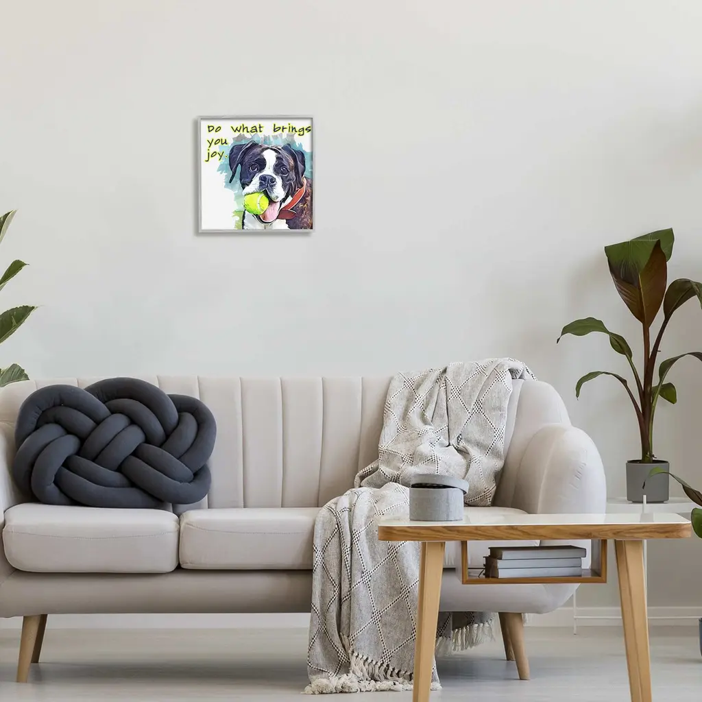 Our Framed Giclee Wall Art adds a touch of class to any space in your home or office. Frames are available in three alluring styles: black, gray farmhouse and white. Our textured artwork will add more depth and dimension to any space. Each piece is mounted with a 1.5 inch thick wood grain frame that is ready to hang! Looking for a statement piece? We have oversized artwork available. Room Type: Living Room, Den, Hallway, Office, Entryway, Study, Dining Room or Bedroom, Guest Room, Studio, Dorm or BoudoirFeatures: Dimensions: 12 x 1.5 x 12 FramedFramed Giclee Sizes Include Standard: 12 x 1.5 x 12 Large: 17 x 1.5 x 17 Oversized: 24 x 1.5 x 24Wall Art is Ready to Hang - No Installation or Hardware Needed. For Easy Set Up Lean or Layer Artwork on Shelf or Against Wall.Our giclée prints are carefully mounted on a durable MDF backing, and then perfectly finished in a 1.5 inch thick woodgrain frame. Mounted frame colors include black, gray farmhouse and white. Made In USA.Artwork Relates To: Tennis Ball, Animal, Canine, Dog, Mammal, Pet, Bulldog, Do What Brings You JoyDesign by Kim Curinga