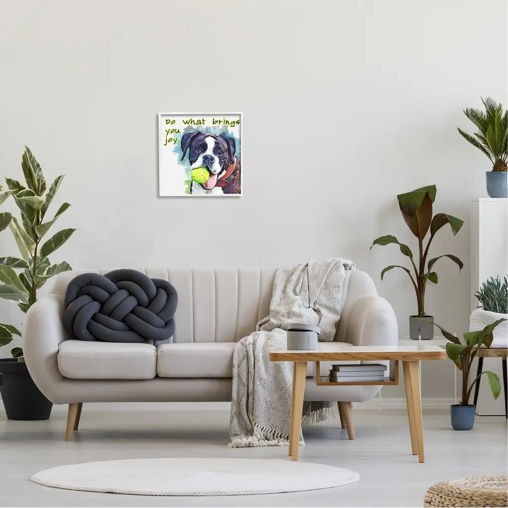 Our Framed Giclee Wall Art adds a touch of class to any space in your home or office. Frames are available in three alluring styles: black, gray farmhouse and white. Our textured artwork will add more depth and dimension to any space. Each piece is mounted with a 1.5 inch thick wood grain frame that is ready to hang! Looking for a statement piece? We have oversized artwork available. Room Type: Living Room, Den, Hallway, Office, Entryway, Study, Dining Room or Bedroom, Guest Room, Studio, Dorm or BoudoirFeatures: Dimensions: 12 x 1.5 x 12 FramedFramed Giclee Sizes Include Standard: 12 x 1.5 x 12 Large: 17 x 1.5 x 17 Oversized: 24 x 1.5 x 24Wall Art is Ready to Hang - No Installation or Hardware Needed. For Easy Set Up Lean or Layer Artwork on Shelf or Against Wall.Our giclée prints are carefully mounted on a durable MDF backing, and then perfectly finished in a 1.5 inch thick woodgrain frame. Mounted frame colors include black, gray farmhouse and white. Made In USA.Artwork Relates To: Tennis Ball, Animal, Canine, Dog, Mammal, Pet, Bulldog, Do What Brings You JoyDesign by Kim Curinga