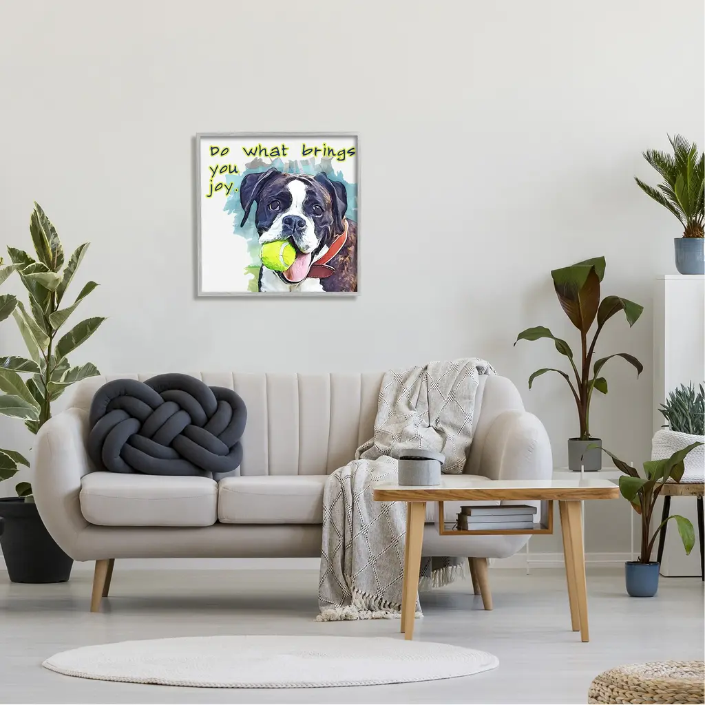 Our Framed Giclee Wall Art adds a touch of class to any space in your home or office. Frames are available in three alluring styles: black, gray farmhouse and white. Our textured artwork will add more depth and dimension to any space. Each piece is mounted with a 1.5 inch thick wood grain frame that is ready to hang! Looking for a statement piece? We have oversized artwork available. Room Type: Living Room, Den, Hallway, Office, Entryway, Study, Dining Room or Bedroom, Guest Room, Studio, Dorm or BoudoirFeatures: Dimensions: 12 x 1.5 x 12 FramedFramed Giclee Sizes Include Standard: 12 x 1.5 x 12 Large: 17 x 1.5 x 17 Oversized: 24 x 1.5 x 24Wall Art is Ready to Hang - No Installation or Hardware Needed. For Easy Set Up Lean or Layer Artwork on Shelf or Against Wall.Our giclée prints are carefully mounted on a durable MDF backing, and then perfectly finished in a 1.5 inch thick woodgrain frame. Mounted frame colors include black, gray farmhouse and white. Made In USA.Artwork Relates To: Tennis Ball, Animal, Canine, Dog, Mammal, Pet, Bulldog, Do What Brings You JoyDesign by Kim Curinga