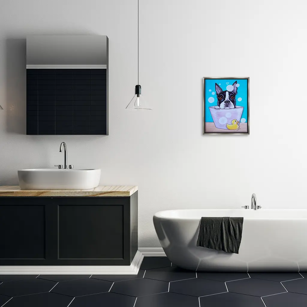 Elevate your home or office to the next level with Stupell Framed Floating Canvas Wall Art. Our premium hand-stretched canvas is mounted securely into a sturdy lightweight frame. The museum-style gap between the wrapped canvas and the box frame gives the illusion of floating artwork. Stupell Wall Art is made in the USA.Features: Dimensions: 17 x 1.7 x 21 Frame, 16 x 1.5 x 20 Canvas ArtFloating Frame Canvas Products are available in sizes 17"x21" and 25"x31". All Floating Frame Canvas Products have a 1.7" Depth.Wall Art is Ready to Hang with Hardware Free Hanging. No Installation required. For Easy Set Up Lean or Layer Artwork on Shelf or Against Wall. Artwork is Permently Fixed into the Frame.Our elevated 1.7" Thick Floating Frame is the perfect complement to our canvas style Wall Art. We use only the highest quality inks in house with industry leading printing solutions. Canvas is hand stretched over a durable wood foundation and then mounted securly into a Modern Box Frame. Made in the USA.Artwork Relates To: Bathroom, Bathtub, Tub, Hygiene, Soap, Bubbles, Dog, Pet, Rubber DuckDesign by Michelle Gilsey