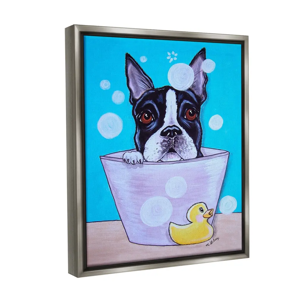 Elevate your home or office to the next level with Stupell Framed Floating Canvas Wall Art. Our premium hand-stretched canvas is mounted securely into a sturdy lightweight frame. The museum-style gap between the wrapped canvas and the box frame gives the illusion of floating artwork. Stupell Wall Art is made in the USA.Features: Dimensions: 17 x 1.7 x 21 Frame, 16 x 1.5 x 20 Canvas ArtFloating Frame Canvas Products are available in sizes 17"x21" and 25"x31". All Floating Frame Canvas Products have a 1.7" Depth.Wall Art is Ready to Hang with Hardware Free Hanging. No Installation required. For Easy Set Up Lean or Layer Artwork on Shelf or Against Wall. Artwork is Permently Fixed into the Frame.Our elevated 1.7" Thick Floating Frame is the perfect complement to our canvas style Wall Art. We use only the highest quality inks in house with industry leading printing solutions. Canvas is hand stretched over a durable wood foundation and then mounted securly into a Modern Box Frame. Made in the USA.Artwork Relates To: Bathroom, Bathtub, Tub, Hygiene, Soap, Bubbles, Dog, Pet, Rubber DuckDesign by Michelle Gilsey