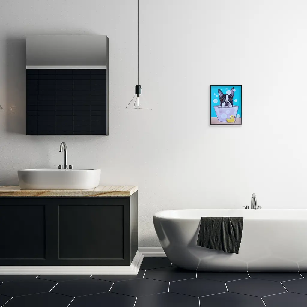 Add dimension to any room with our textured Framed Giclee Artwork. Our framed artwork is securely mounted into a 1.5-inch thick wood grain frame and ready to hang. Frames are available in three alluring styles: black, gray farmhouse and white. In addition, you should check out our oversized options if you want a statement piece. Stupell Wall Art is made in the USA.Features: Dimensions: 11 x 1.5 x 14 FramedFramed Giclee Products are available in the sizes 11"x14", 16"x20" or 24"x30". All Framed Giclee Products have a 1.5" Depth. Wall Art is Ready to Hang with Hardware Free Hanging. No installation required. For Easy Set Up Lean or Layer Artwork on Shelf or Against Wall.Our giclée prints are carefully mounted on a durable MDF backing, and then perfectly finished in a 1.5 inch thick woodgrain frame. Mounted frame colors include black, gray farmhouse and white. Made In USA.Artwork Relates To: Bathroom, Bathtub, Tub, Hygiene, Soap, Bubbles, Dog, Pet, Rubber DuckDesign by Michelle Gilsey