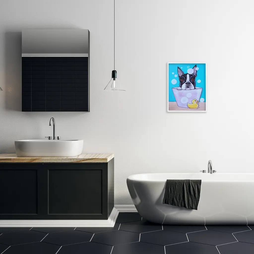 Add dimension to any room with our textured Framed Giclee Artwork. Our framed artwork is securely mounted into a 1.5-inch thick wood grain frame and ready to hang. Frames are available in three alluring styles: black, gray farmhouse and white. In addition, you should check out our oversized options if you want a statement piece. Stupell Wall Art is made in the USA.Features: Dimensions: 11 x 1.5 x 14 FramedFramed Giclee Products are available in the sizes 11"x14", 16"x20" or 24"x30". All Framed Giclee Products have a 1.5" Depth. Wall Art is Ready to Hang with Hardware Free Hanging. No installation required. For Easy Set Up Lean or Layer Artwork on Shelf or Against Wall.Our giclée prints are carefully mounted on a durable MDF backing, and then perfectly finished in a 1.5 inch thick woodgrain frame. Mounted frame colors include black, gray farmhouse and white. Made In USA.Artwork Relates To: Bathroom, Bathtub, Tub, Hygiene, Soap, Bubbles, Dog, Pet, Rubber DuckDesign by Michelle Gilsey