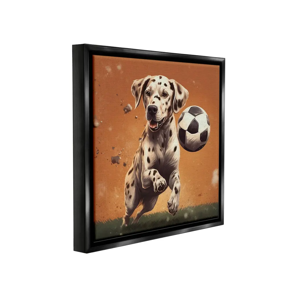 Elevate your home or office to the next level with Stupell Framed Floating Canvas Wall Art. Our premium hand-stretched canvas is mounted securely into a sturdy lightweight frame. The museum-style gap between the wrapped canvas and the box frame gives the illusion of floating artwork. Stupell Wall Art is made in the USA.Features: Dimensions: 18 x 1.7 x 18 Frame, 17 x 1.5 x 17 Canvas ArtFloating Frame Canvas Products are available in sizes 18"x18" and 25"x25". All Floating Frame Canvas Products have a 1.7" Depth.Wall Art is Ready to Hang with Hardware Free Hanging. No Installation required. For Easy Set Up Lean or Layer Artwork on Shelf or Against Wall. Artwork is Permently Fixed into the Frame.Our elevated 1.7" Thick Floating Frame is the perfect complement to our canvas style Wall Art. We use only the highest quality inks in house with industry leading printing solutions. Canvas is hand stretched over a durable wood foundation and then mounted securly into a Modern Box Frame. Made in the USA.Artwork Relates To: Football, Soccer, Soccer Ball, Sport, Animal, Canine, Dog, Mammal, Pet, Dalmatian, PuppyDesign by Lazar Studio