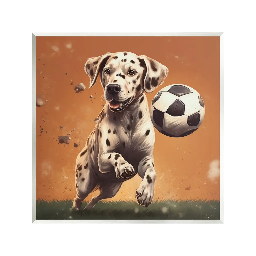 Add dimension to any room with our textured Framed Giclee Artwork. Our framed artwork is securely mounted into a 1.5-inch thick wood grain frame and ready to hang. Frames are available in three alluring styles: black, gray farmhouse and white. In addition, you should check out our oversized options if you want a statement piece. Stupell Wall Art is made in the USA.Features: Dimensions: 12 x 1.5 x 12 FramedFramed Giclee Product Sizes Include 12"x12", 17"x17", and 24"x24". Framed Giclee Products have a 1.5" Depth. Wall Art is Ready to Hang with Hardware Free Hanging. No installation required. For Easy Set Up Lean or Layer Artwork on Shelf or Against Wall.Our giclée prints are carefully mounted on a durable MDF backing, and then perfectly finished in a 1.5 inch thick woodgrain frame. Mounted frame colors include black, gray farmhouse and white. Made In USA.Artwork Relates To: Football, Soccer, Soccer Ball, Sport, Animal, Canine, Dog, Mammal, Pet, Dalmatian, PuppyDesign by Lazar Studio