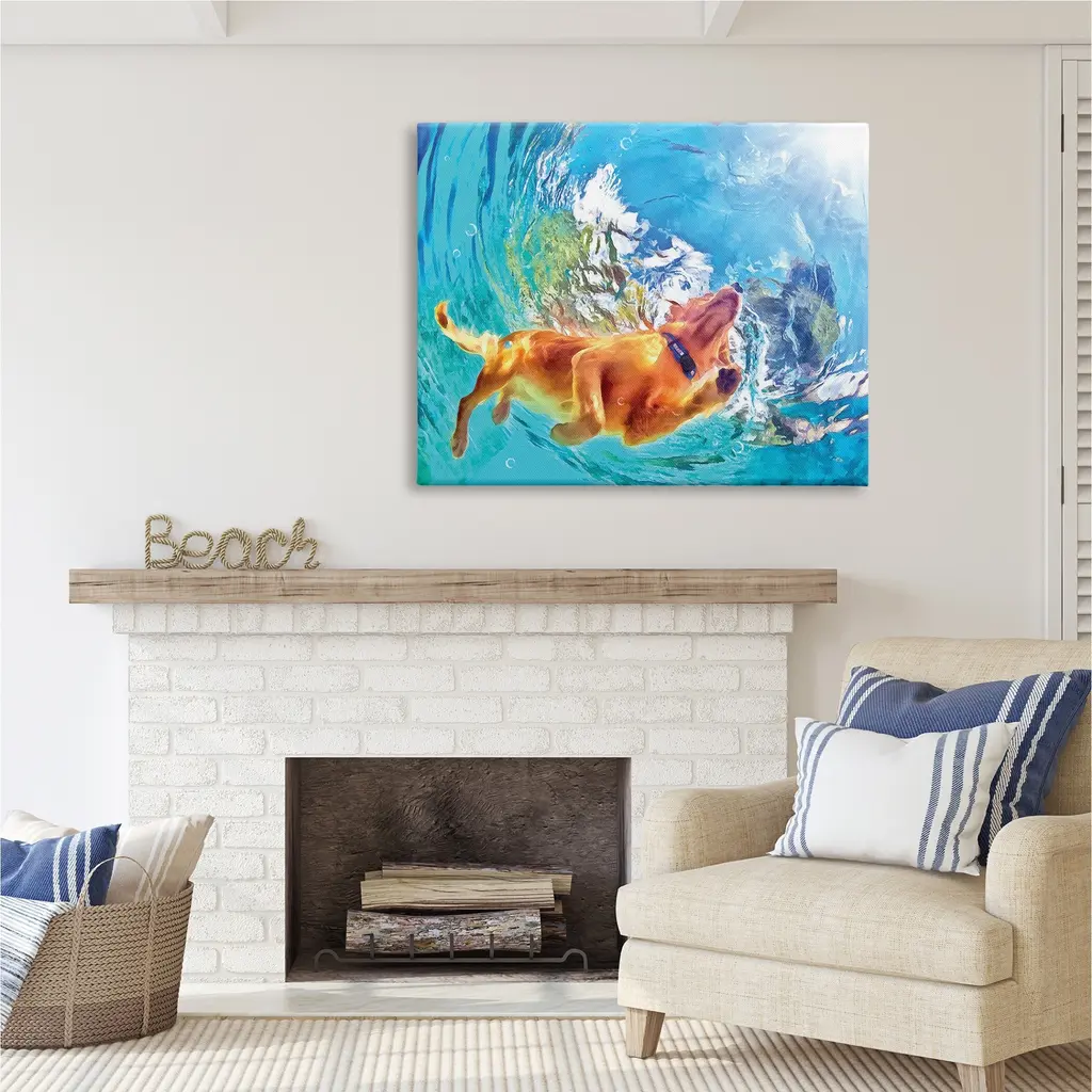 We create our stretched canvas to the highest standards. Using only the highest quality inks and canvas on Mimaki printers, we hand-cut and stretch each piece over a 1.5-inch thick wooden frame for hanging. As a result, the art comes ready to hang on the sturdy ledge with no installation required. Stupell Wall Art is made in the USA.Features: Dimensions: 20 x 1.5 x 16 InchesStretched Canvas Sizes Include Standard: 20 x 1.5 x 16 Large: 30 x 1.5 x 20 X-Large: 40 x 1.5 x 30 Oversized: 48 x 1.5 x 36Wall Art is Ready to Hang with Hardware Free Hanging. No installation required. For Easy Set Up Lean or Layer Artwork on Shelf or Against Wall.Our stretched canvas is created with the highest standards. We use only the highest quality inks and canvas on our in house Mimaki printers, and then hand cut and stretch each piece over a 1.5 inch thick wooden frame for hanging. Made In USA.Artwork Relates To: Swimming, Water, Animal, Dog, PetDesign by Masey St. Studios