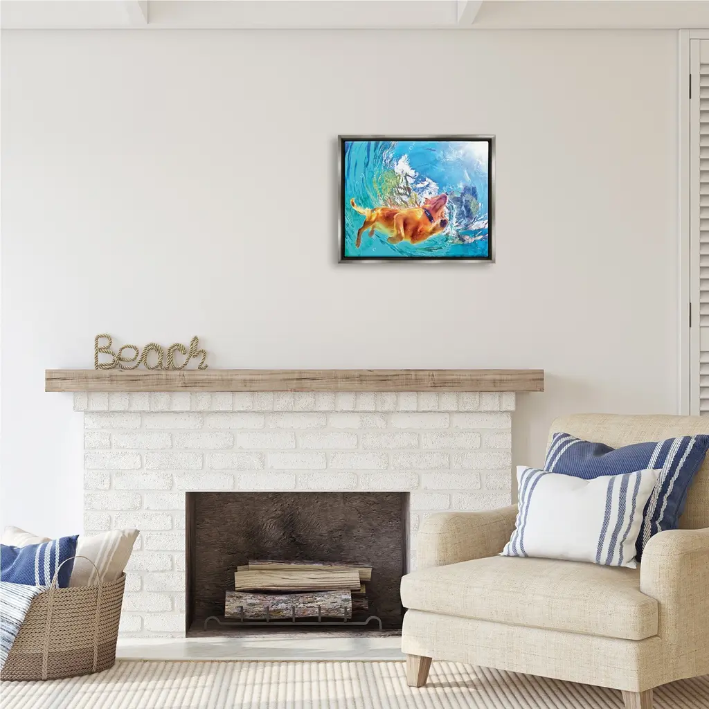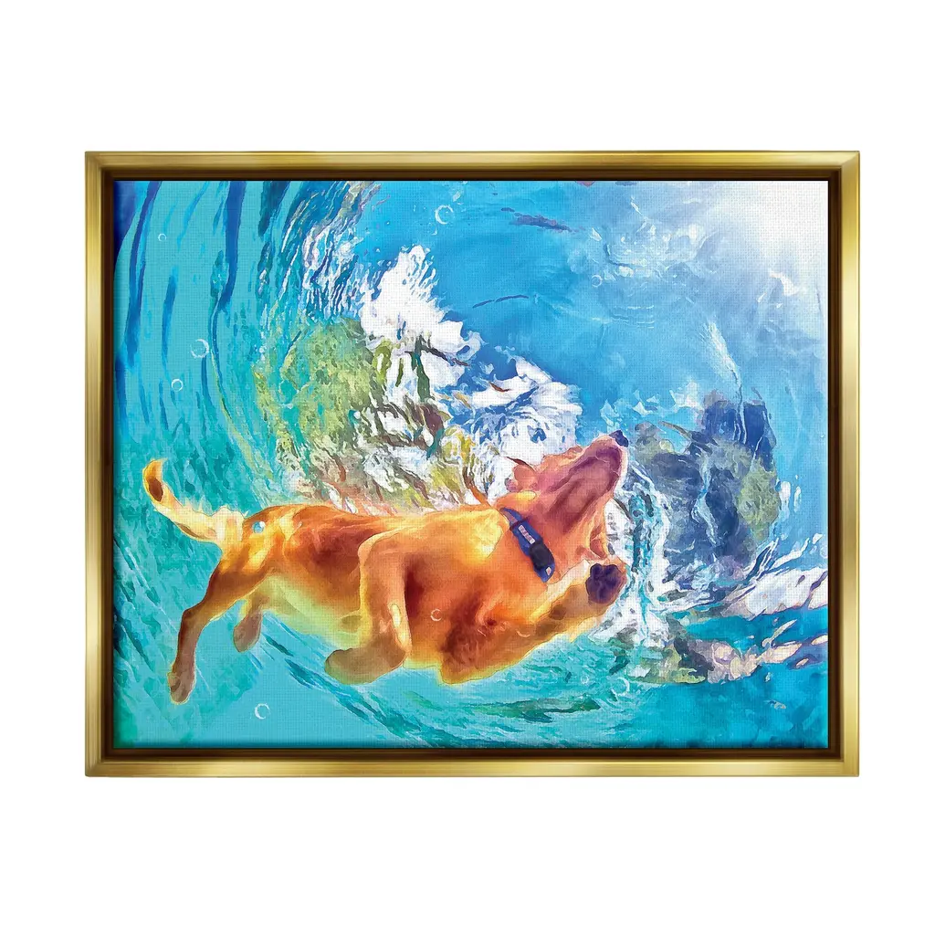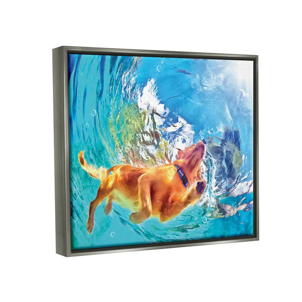 Elevate your home or office to the next level with Stupell Framed Floating Canvas Wall Art. Our premium hand-stretched canvas is mounted securely into a sturdy lightweight frame. The museum-style gap between the wrapped canvas and the box frame gives the illusion of floating artwork. Stupell Wall Art is made in the USA.Features: Dimensions: 21 x 1.7 x 17 Frame, 20 x 1.5 x 16 Canvas ArtFloating Frame Sizes Include Standard: 21 x 1.7 x 17 Oversized: 31 x 1.7 x 25Wall Art is Ready to Hang with Hardware Free Hanging. No installation required. For Easy Set Up Lean or Layer Artwork on Shelf or Against Wall.Our elevated 1.7" Thick Floating Frame is the perfect complement to our canvas style Wall Art. We use only the highest quality inks in house with industry leading printing solutions. Canvas is hand stretched over a durable wood foundation and then mounted securly into a Modern Box Frame. Made in the USA.Artwork Relates To: Swimming, Water, Animal, Dog, PetDesign by Masey St. Studios
