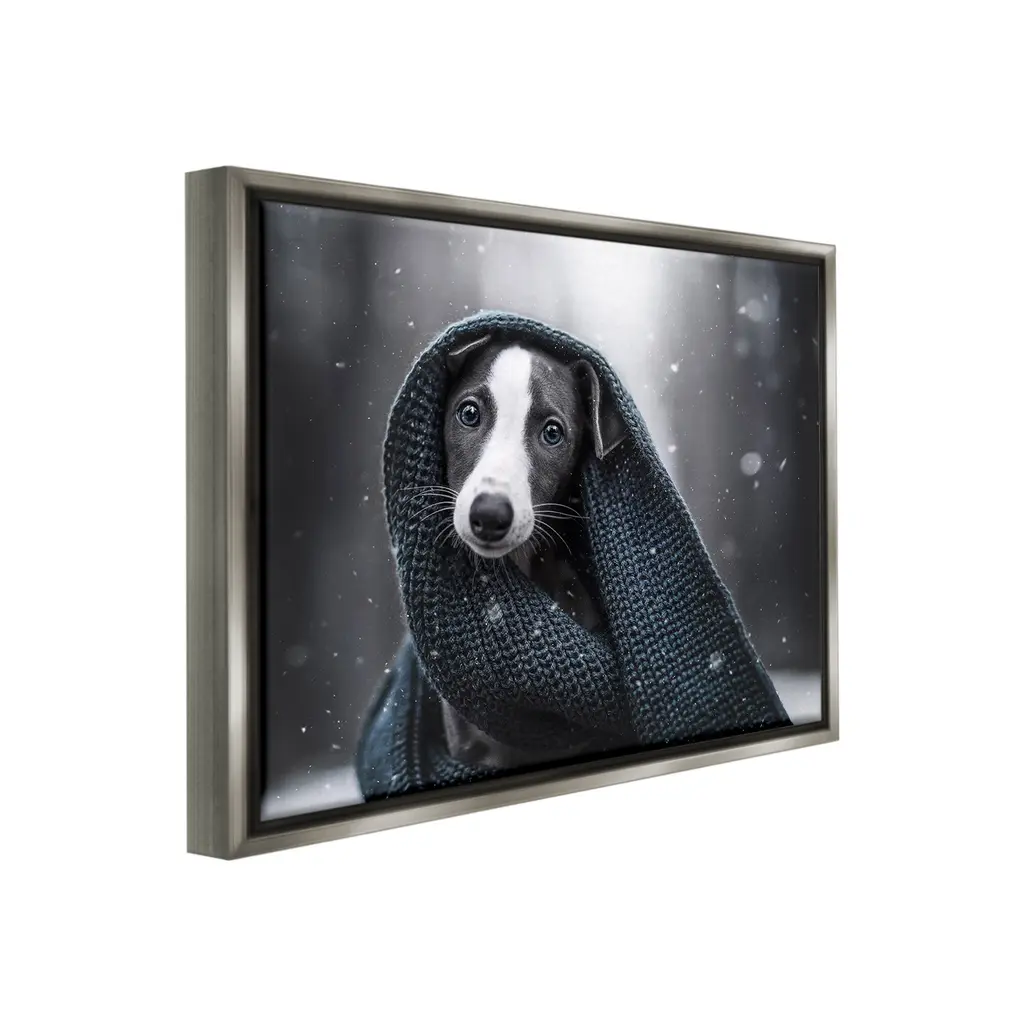 Elevate your home or office to the next level with Stupell Framed Floating Canvas Wall Art. Our premium hand-stretched canvas is mounted securely into a sturdy lightweight frame. The museum-style gap between the wrapped canvas and the box frame gives the illusion of floating artwork. Stupell Wall Art is made in the USA.Features: Dimensions: 21 x 1.7 x 17 Frame, 20 x 1.5 x 16 Canvas ArtFloating Frame Canvas Products are available in sizes 21"x17" and 31"x25". All Floating Frame Canvas Products have a 1.7" Depth.Wall Art is Ready to Hang with Hardware Free Hanging. No Installation required. For Easy Set Up Lean or Layer Artwork on Shelf or Against Wall. Artwork is Permently Fixed into the Frame.Our elevated 1.7" Thick Floating Frame is the perfect complement to our canvas style Wall Art. We use only the highest quality inks in house with industry leading printing solutions. Canvas is hand stretched over a durable wood foundation and then mounted securly into a Modern Box Frame. Made in the USA.Artwork Relates To: Animal, Canine, Dog, Mammal, Pet, Puppy, Blanket, Scarf, Portrait, Nature, Winter, SnowDesign by Natalie Grosse