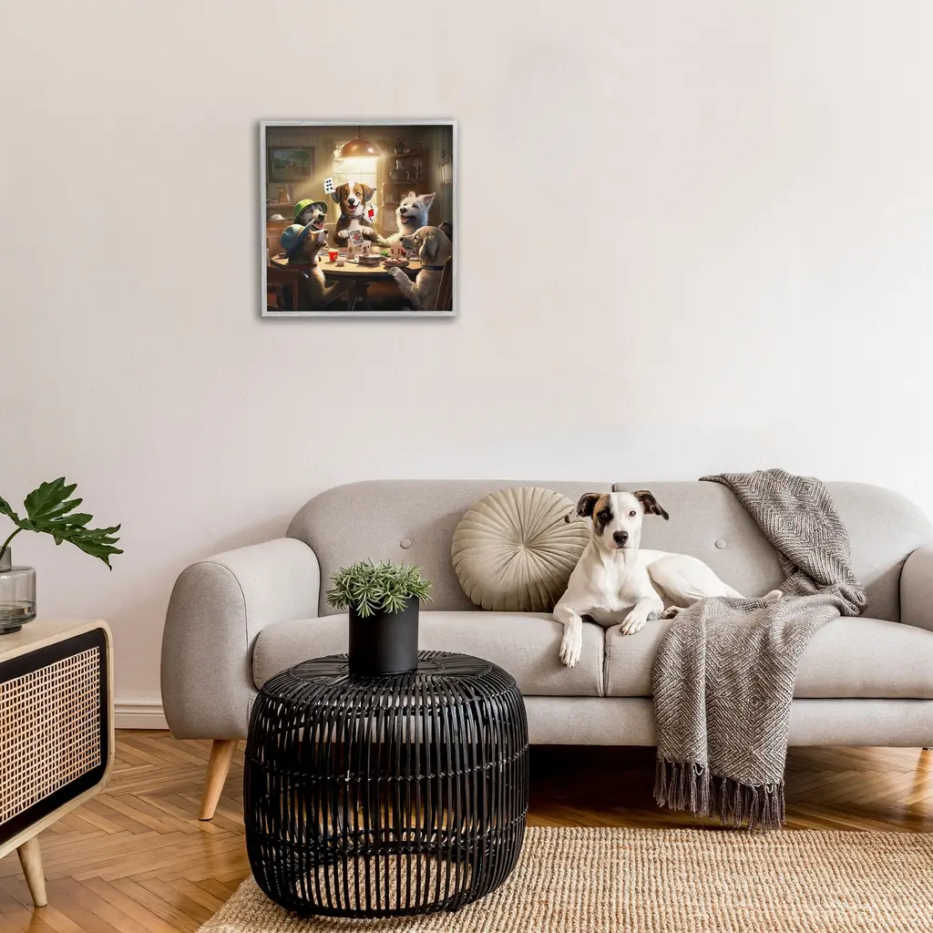 Add dimension to any room with our textured Framed Giclee Artwork. Our framed artwork is securely mounted into a 1.5-inch thick wood grain frame and ready to hang. Frames are available in three alluring styles: black, gray farmhouse and white. In addition, you should check out our oversized options if you want a statement piece. Stupell Wall Art is made in the USA.Features: Dimensions: 12 x 1.5 x 12 FramedFramed Giclee Product Sizes Include 12"x12", 17"x17", and 24"x24". Framed Giclee Products have a 1.5" Depth. Wall Art is Ready to Hang with Hardware Free Hanging. No installation required. For Easy Set Up Lean or Layer Artwork on Shelf or Against Wall.Our giclée prints are carefully mounted on a durable MDF backing, and then perfectly finished in a 1.5 inch thick woodgrain frame. Mounted frame colors include black, gray farmhouse and white. Made In USA.Artwork Relates To: Fun, Animal, Canine, Dog, Mammal, Pet, Humor, Funny, Cards, Game, Magic TrickDesign by Jim Baldwin