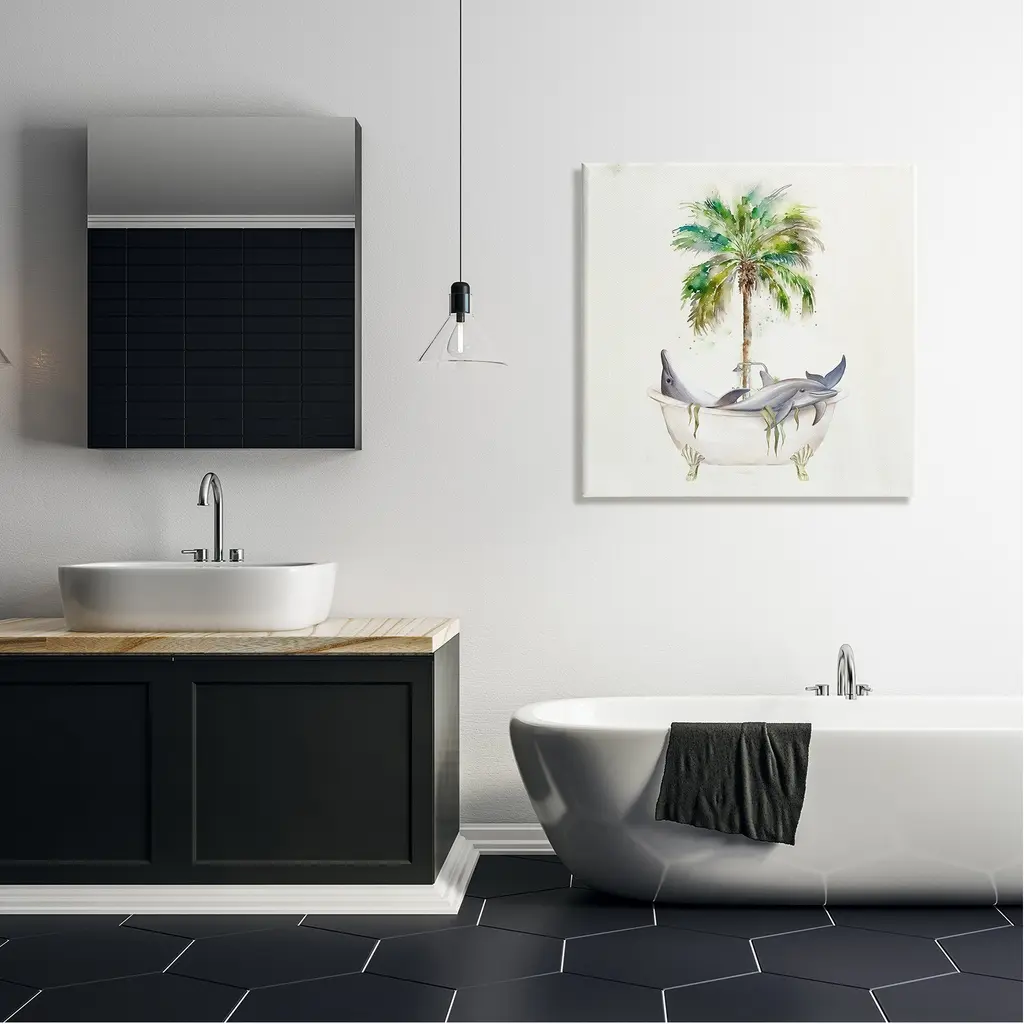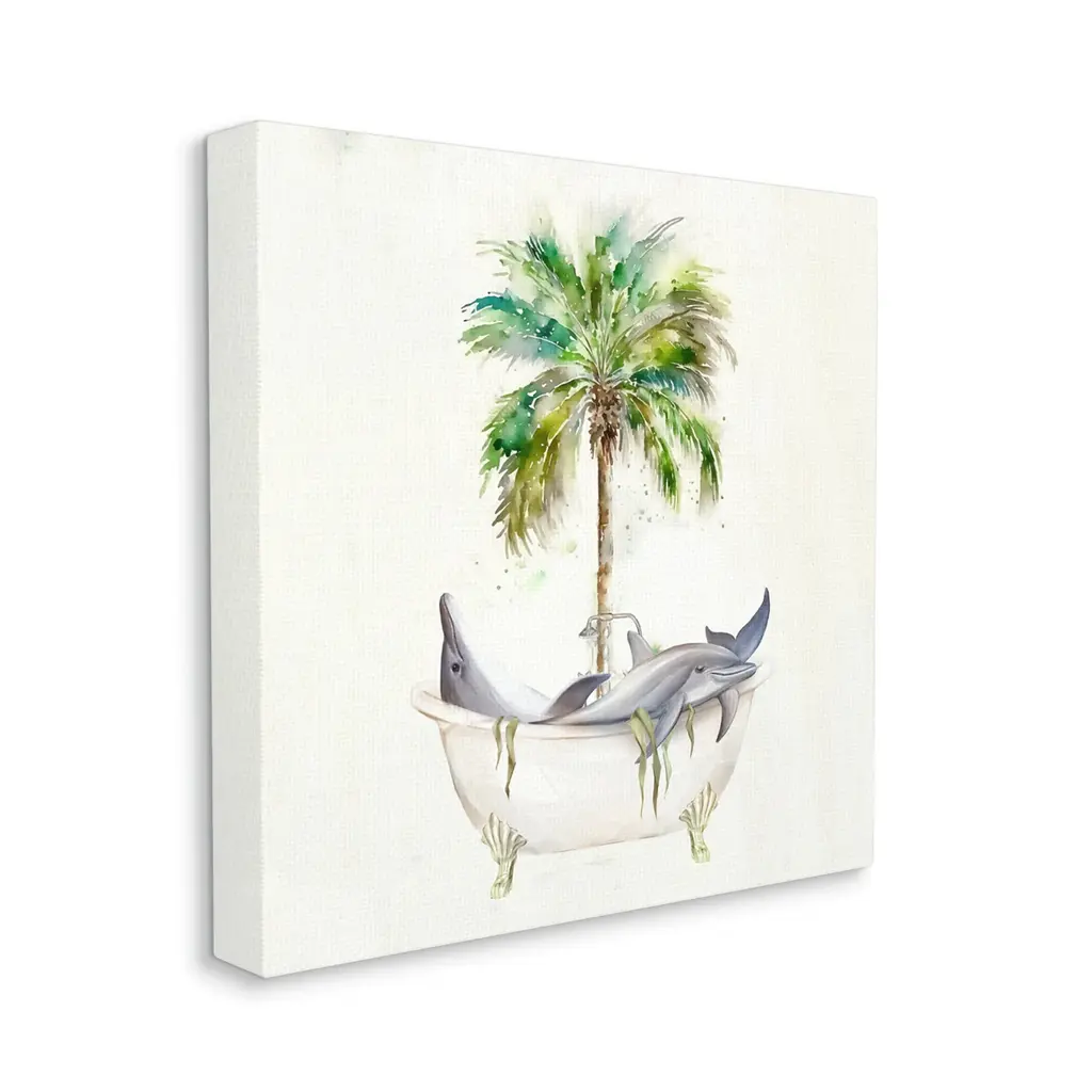 We create our stretched canvas to the highest standards. Using only the highest quality inks and canvas on Mimaki printers, we hand-cut and stretch each piece over a 1.5-inch thick wooden frame for hanging. As a result, the art comes ready to hang on the sturdy ledge with no installation required. Stupell Wall Art is made in the USA.Features: Dimensions: 17 x 1.5 x 17 InchesStretched Canvas Sizes Include Standard: 17 x 1.5 x 17 Large: 24 x 1.5 x 24 X-Large: 30 x 1.5 x 30 Oversized: 36 x 1.5 x 36Wall Art is Ready to Hang - No Installation or Hardware Needed. For Easy Set Up Lean or Layer Artwork on Shelf or Against Wall.Our stretched canvas is created with the highest standards. We use only the highest quality inks and canvas on our in house Mimaki printers, and then hand cut and stretch each piece over a 1.5 inch thick wooden frame for hanging. Made In USA.Artwork Relates To: Tub, Bathing, Bathtub, Animal, Sea Life, Bathroom, Dolphin, Palm Tree, TropicalDesign by Ziwei Li